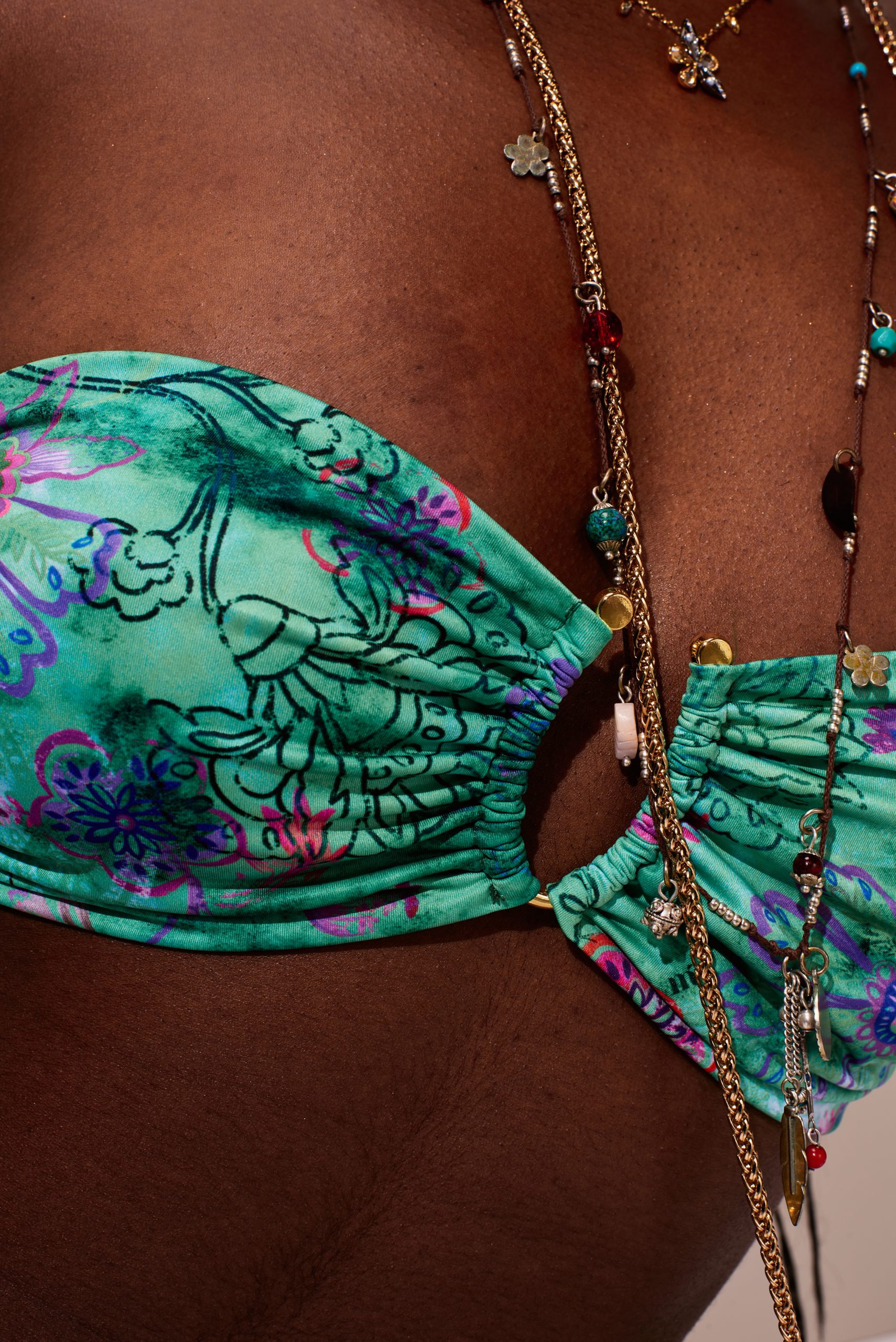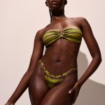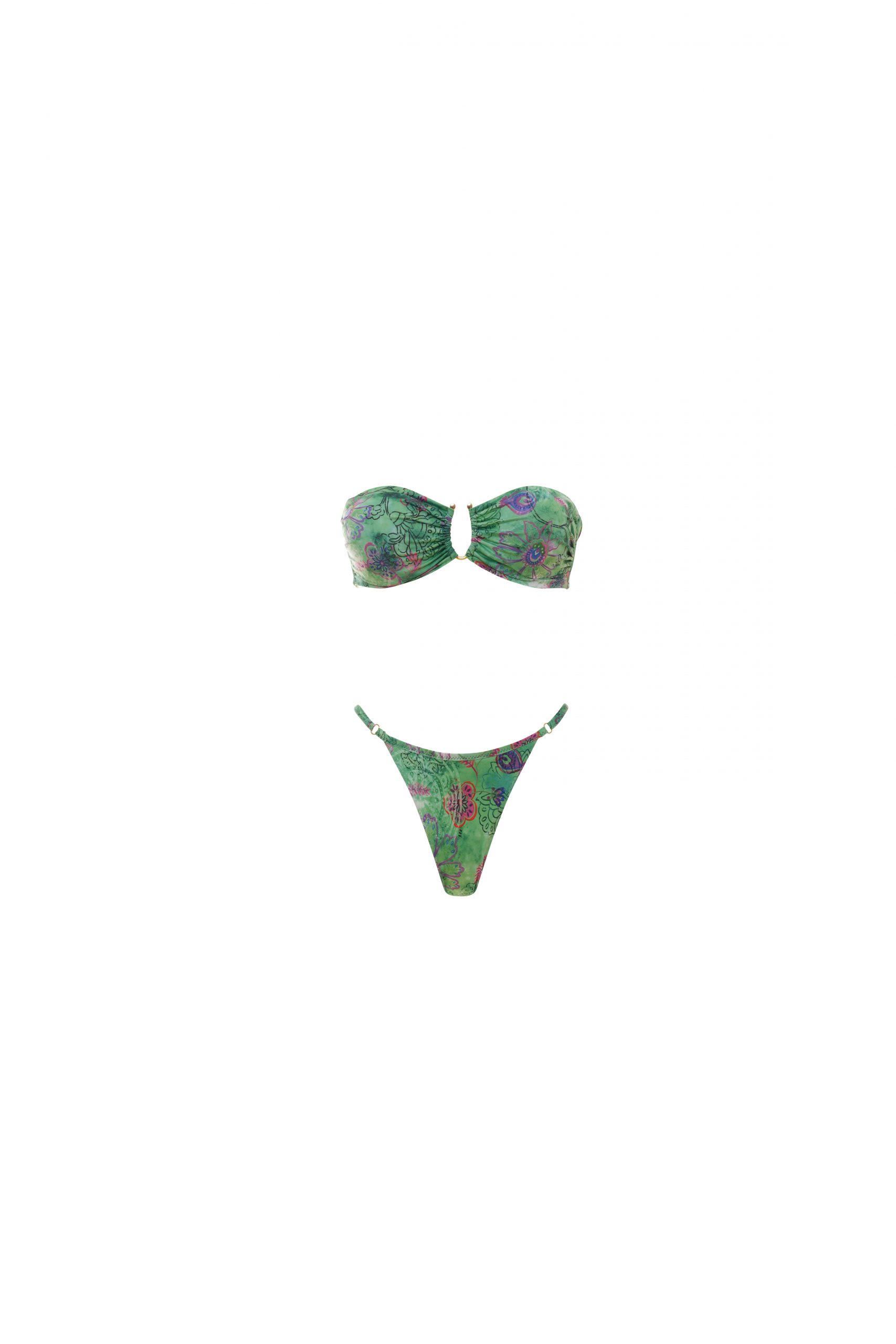 Ambre è il bikini che un top a fascia, impreziosito da un anello dorato centrale e uno slip sgambato regolabile. Lo slip ha una copertura minimal che rende i tuoi look sexy e femminili. Il top è dotato di coppe estraibili e un allacciatura sul retro con laccetti regolabili a piacimento. In fantasia bohemia di colore verde, una stampa unica per look estivo impeccabile. Realizzato in microfibra, un tessuto leggero e resistente, perfetto per costumi da bagno confortevoli.