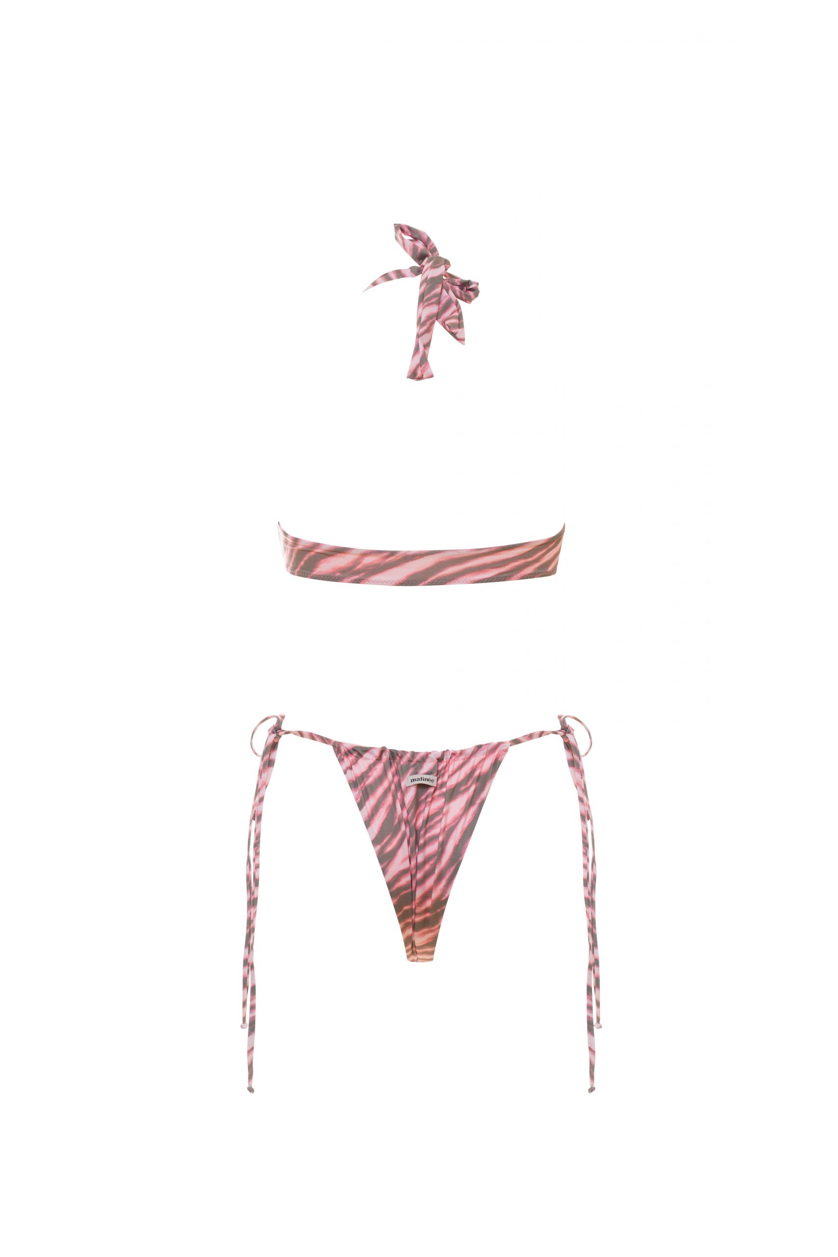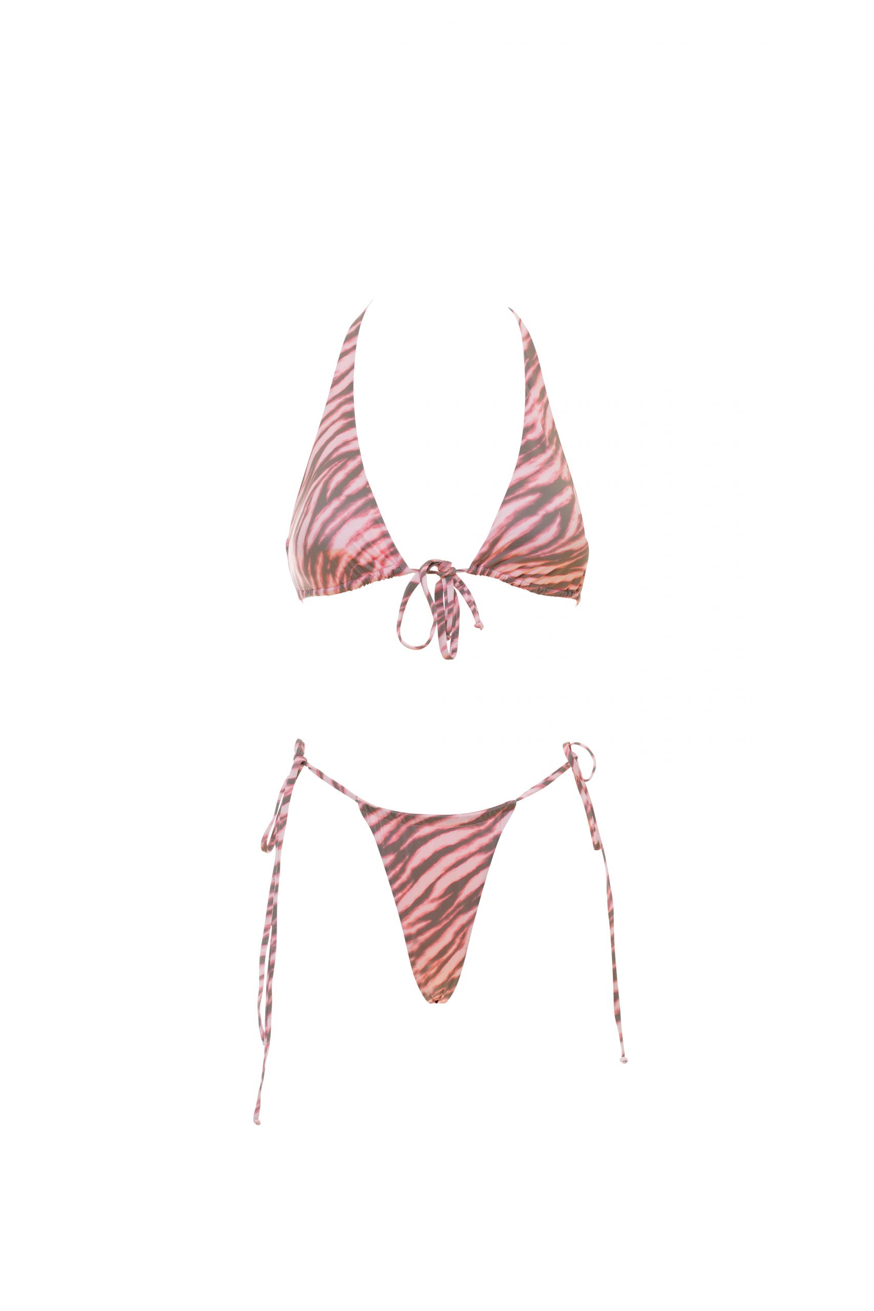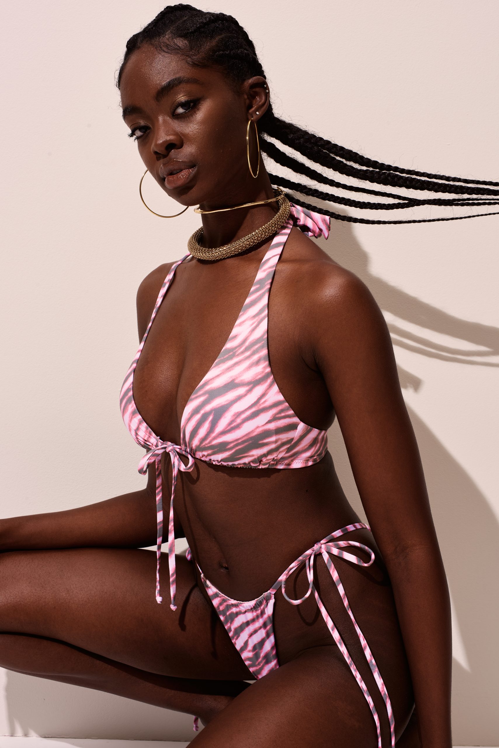 Benedetta è il bikini super trendy che combina un top a triangolo con allacciatura sul davanti, spalline larghe fisse e coppa estraibile, con uno slip a brasiliana dalla vestibilità minimal. Lo slip è dotato di laccetti annodabili sui fianchi, che ti permettono di personalizzarlo in base alla tua silhouette. In fantasia zebrato di colore rosa, per look selvaggi e trendy. Realizzato in microfibra, un tessuto leggero e resistente per costumi da bagno confortevoli.