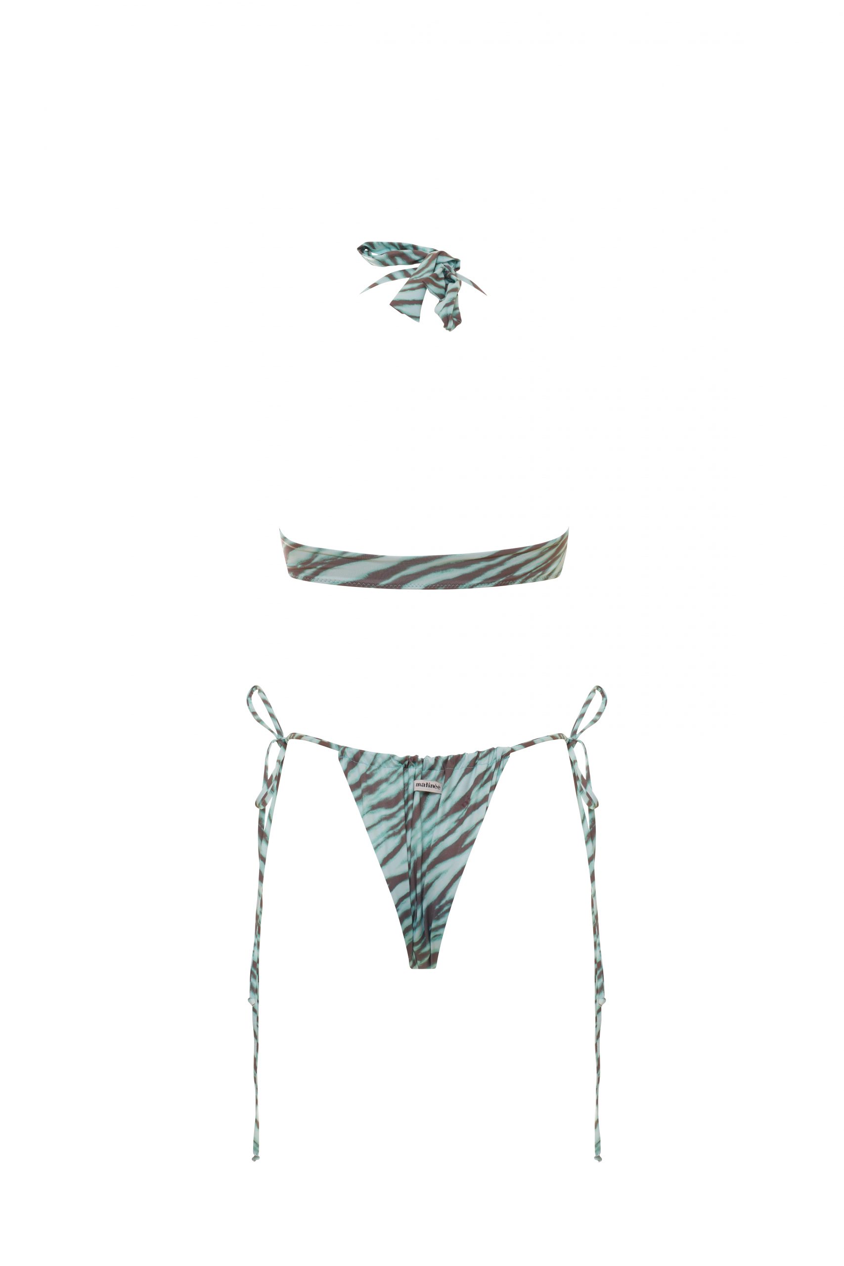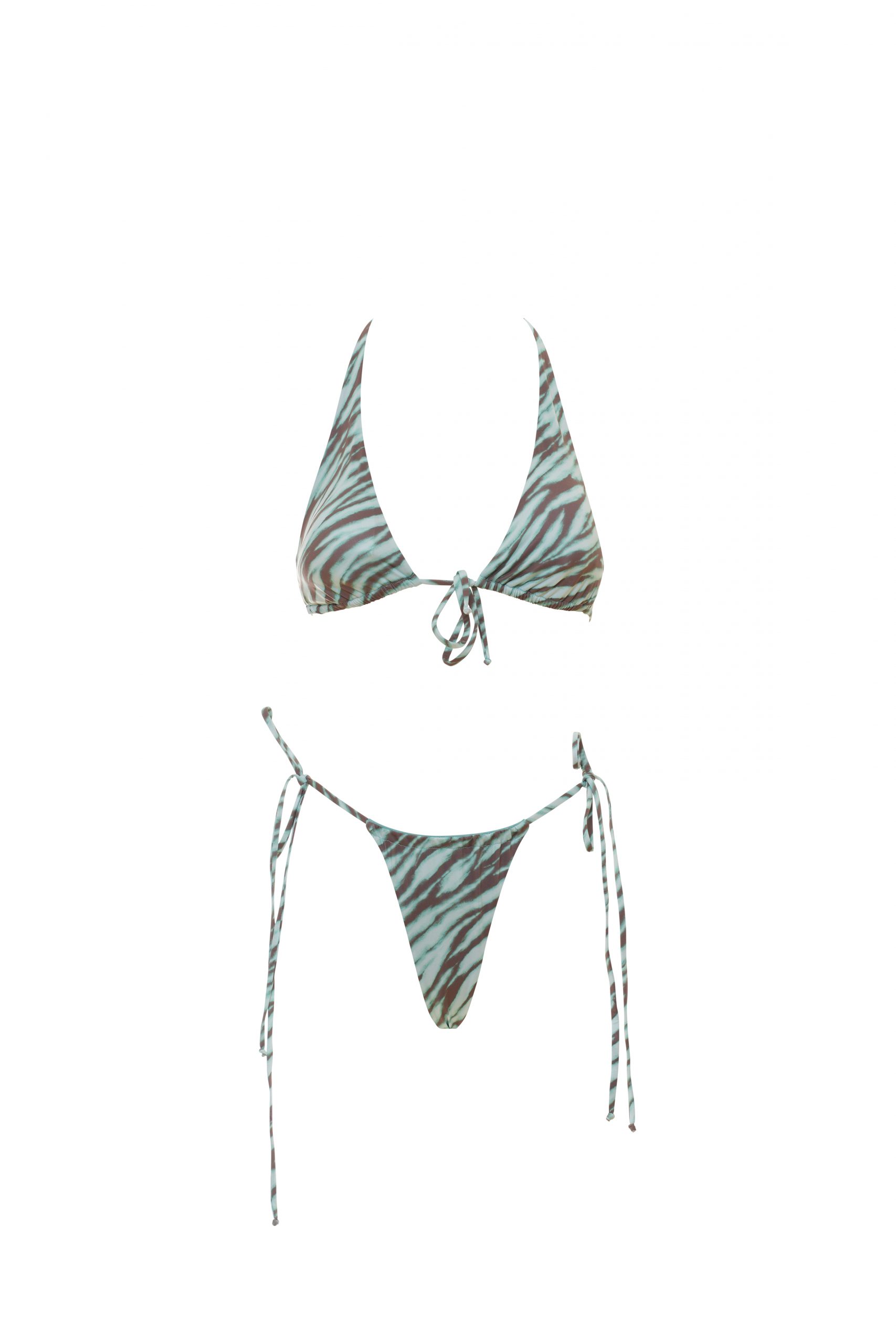 Benedetta è il bikini super trendy che combina un top a triangolo con allacciatura sul davanti, spalline larghe fisse e coppa estraibile, con uno slip a brasiliana dalla vestibilità minimal. Lo slip è dotato di laccetti annodabili sui fianchi, che ti permettono di personalizzarlo in base alla tua silhouette. In fantasia zebrato di colore verde, per look selvaggi e trendy. Realizzato in microfibra, un tessuto leggero e resistente per costumi da bagno confortevoli.