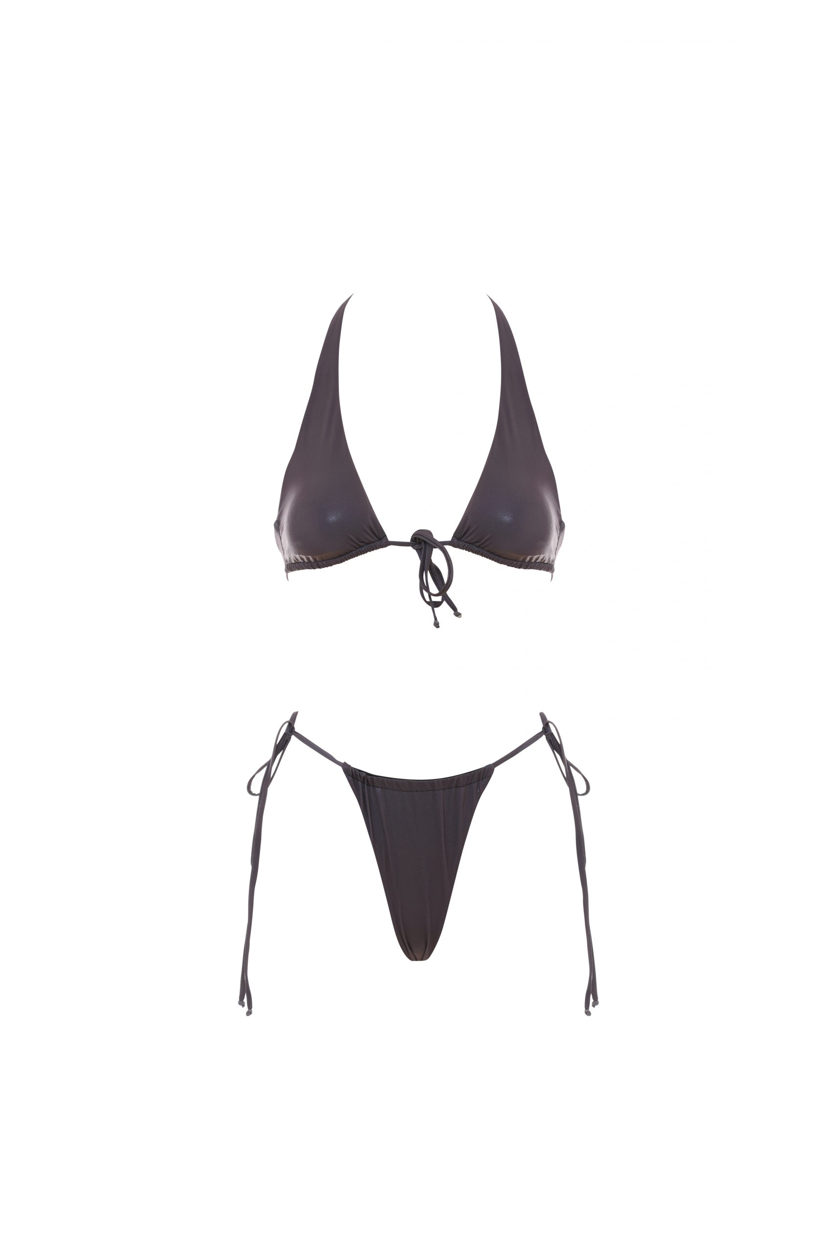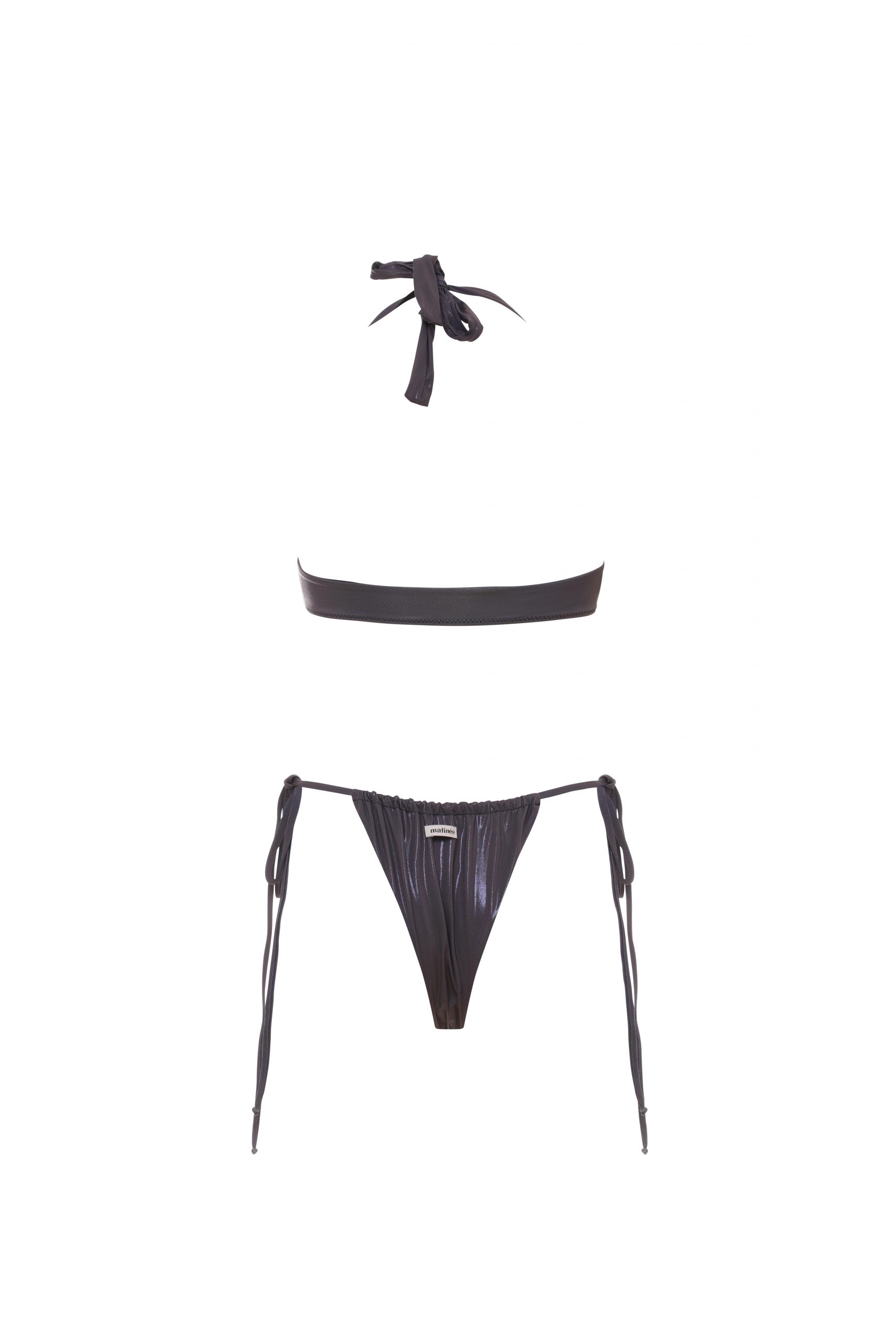 Benedetta è il bikini super trendy che combina un top a triangolo con allacciatura sul davanti, spalline larghe fisse e coppa estraibile, con uno slip a brasiliana dalla vestibilità minimal. Lo slip è dotato di laccetti annodabili sui fianchi, che ti permettono di personalizzarlo in base alla tua silhouette. In tinta unita di colore nero. Realizzato in lamina, un materiale riflettente che aggiunge un tocco glamour ai costumi da bagno.