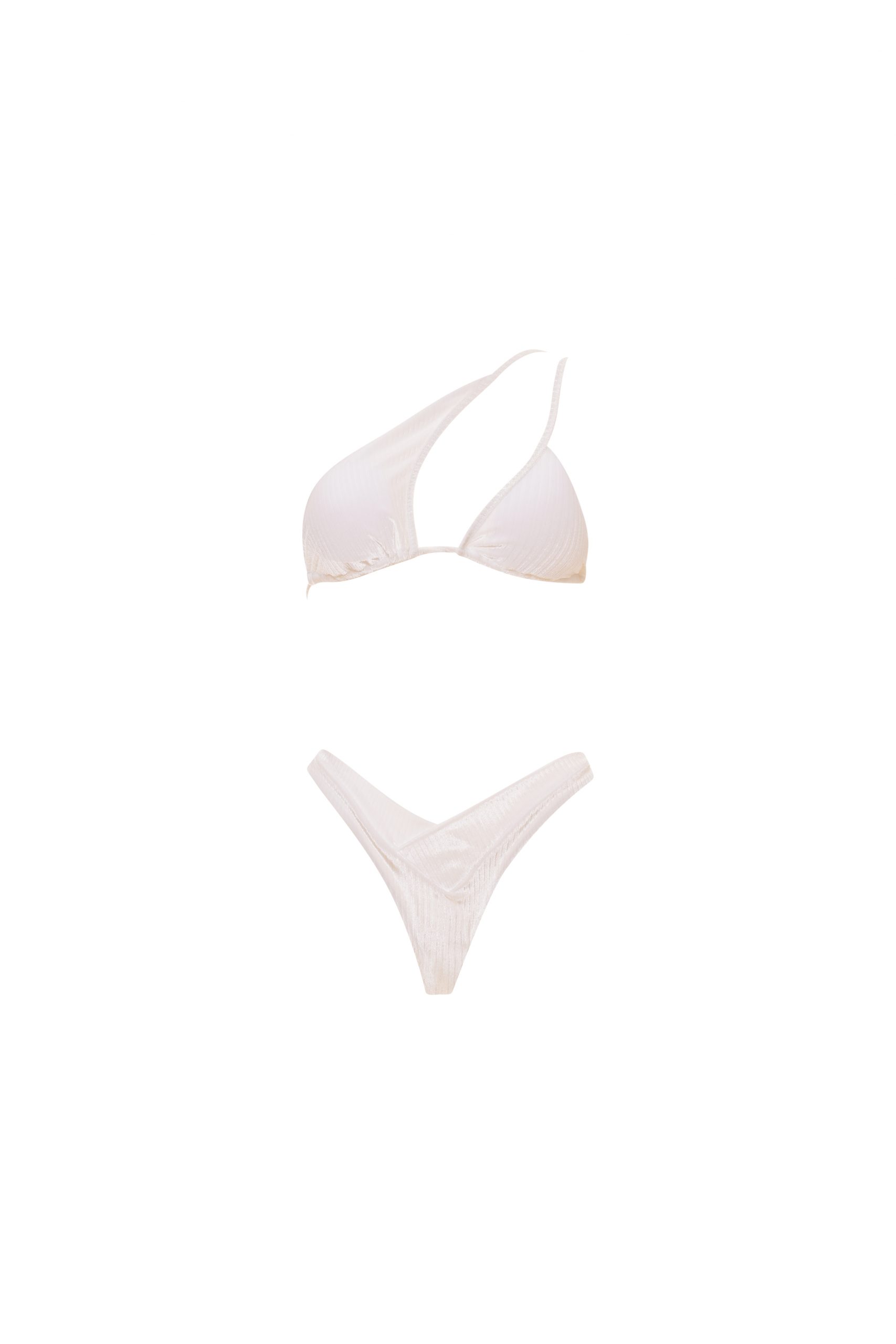 Bianca è il bikini dal design intramontabile. Il suo top a triangolo monospalla è particolare e femminile. È dotato di coppe estraibili e laccetti regolabili. Il suo slip a vita bassa ha uno scollo a V sul davanti e una sgambatura a brasiliana.