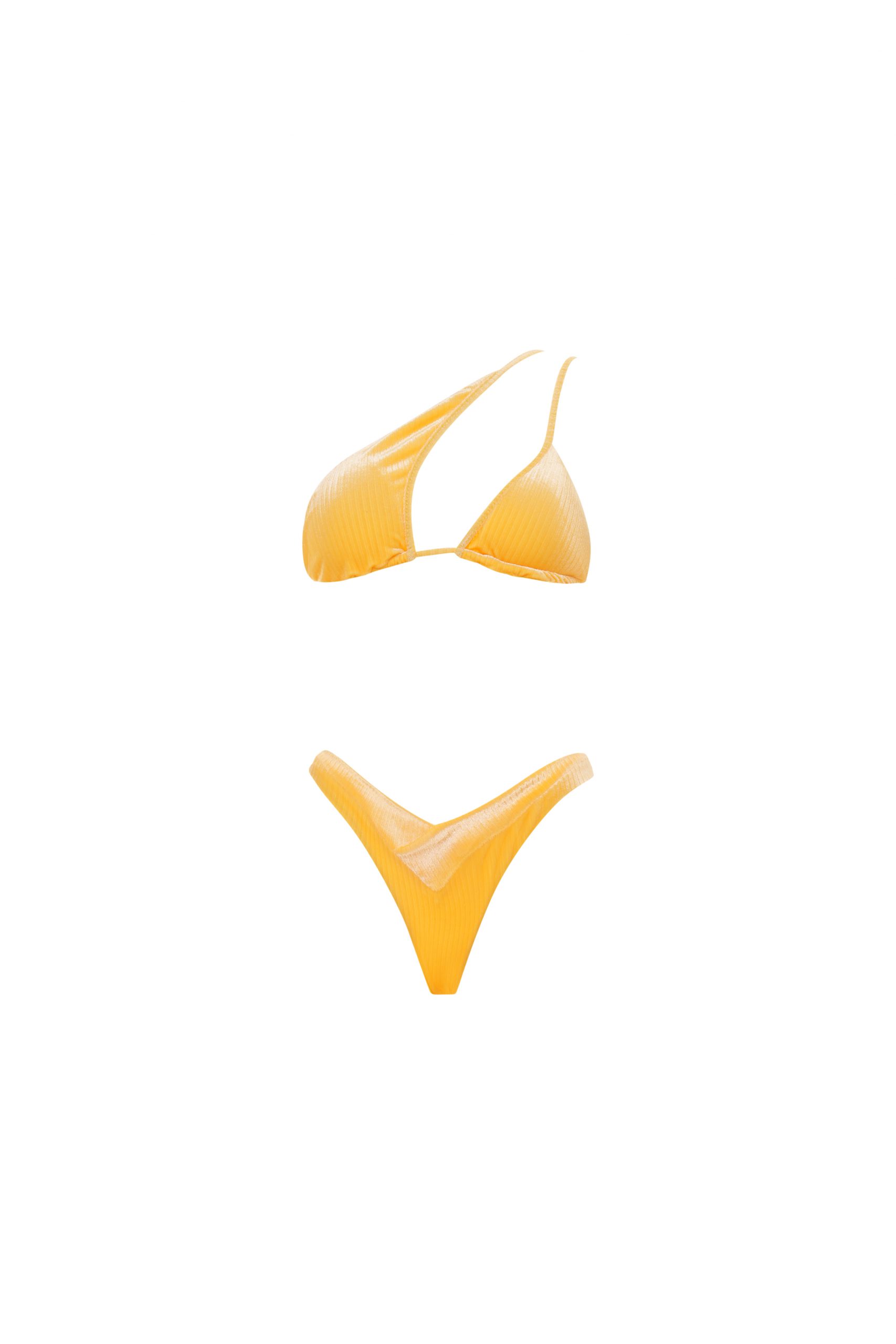 Bianca è il bikini dal design intramontabile. Il suo top a triangolo monospalla è particolare e femminile. È dotato di coppe estraibili e laccetti regolabili. Il suo slip a vita bassa ha uno scollo a V sul davanti e una sgambatura a brasiliana.