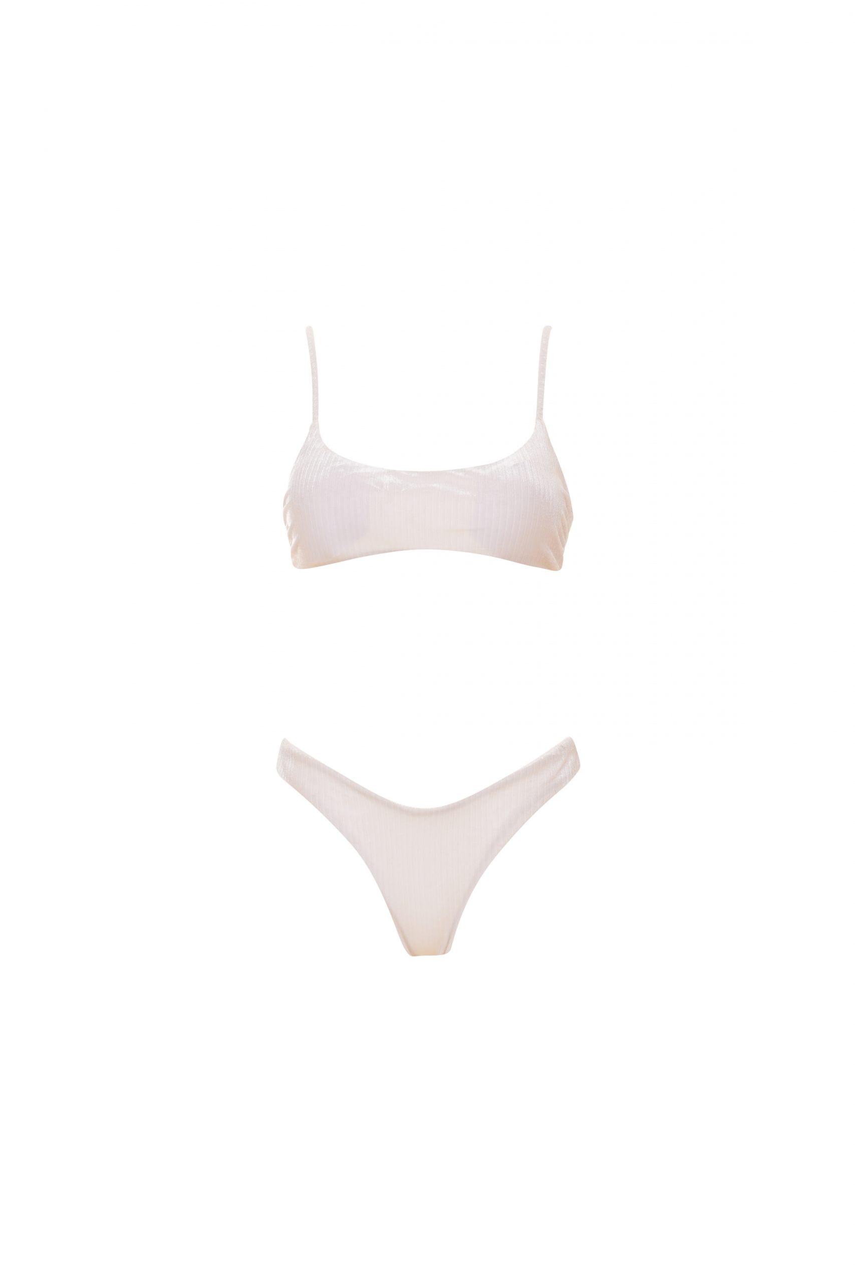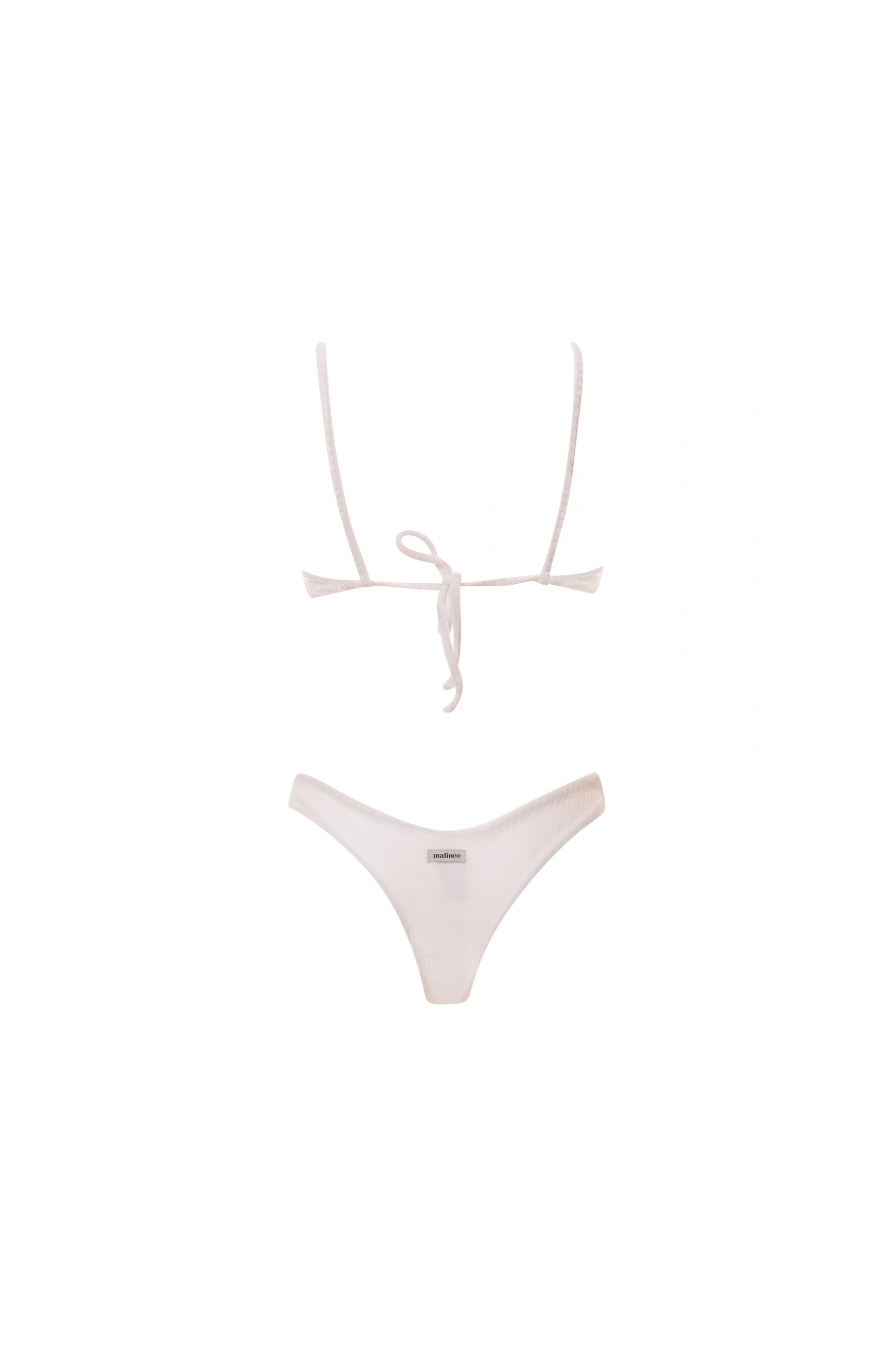 Dora è il bikini che combina un top a fascia con imbottitura estraibile, e uno slip a brasiliana con taglio a V. La chiusura del top è regolabile, grazie ai laccetti annodabili, per garantirti il massimo della personalizzazione.