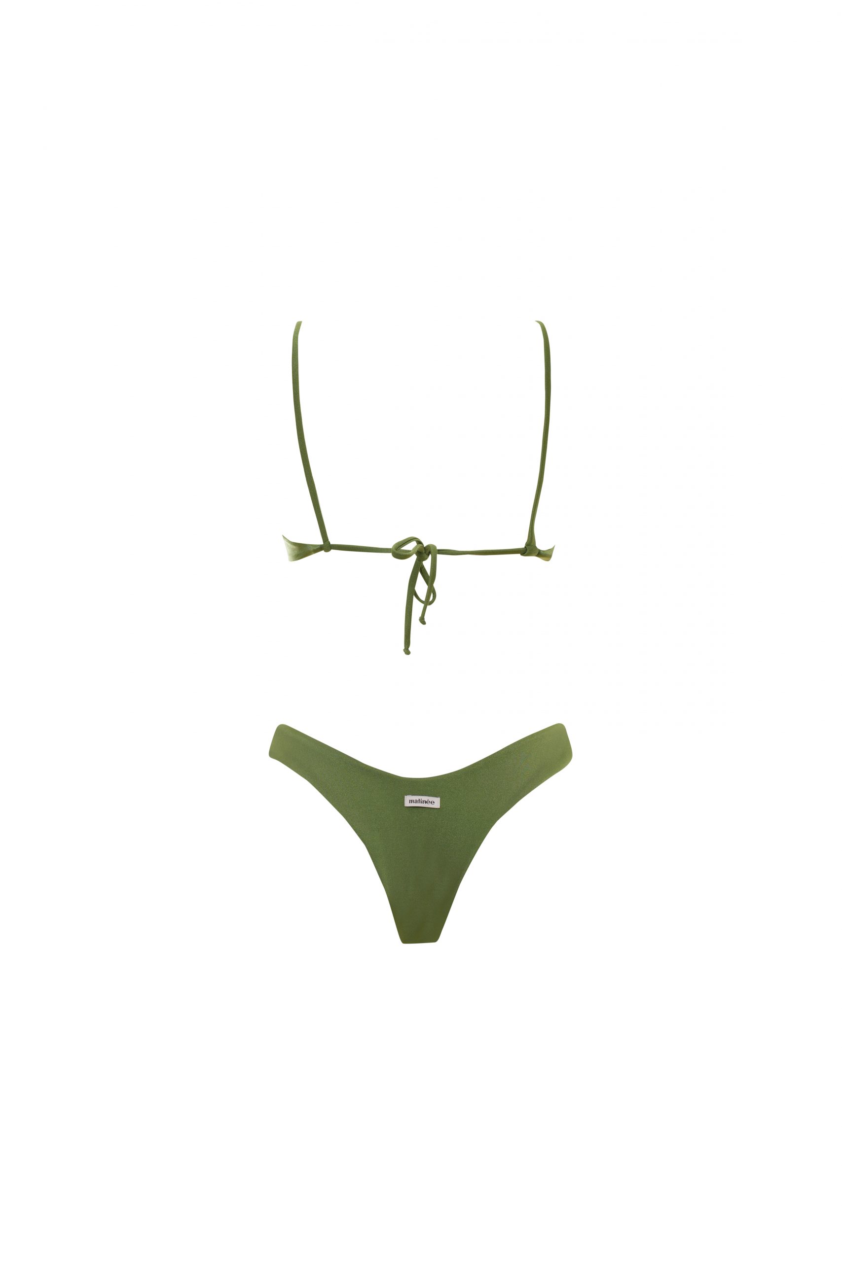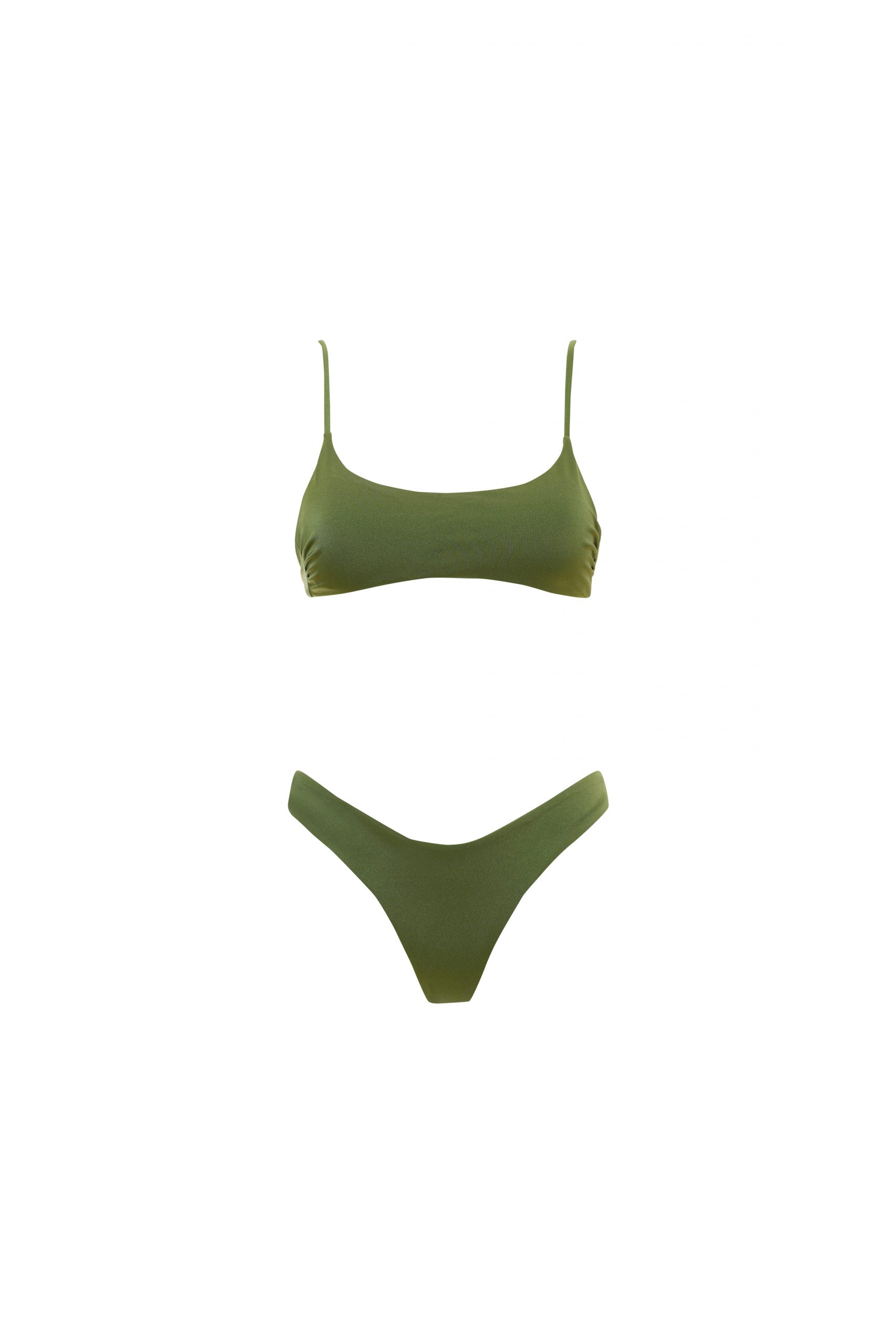 Dora è il bikini che combina un top a fascia con imbottitura estraibile, e uno slip a brasiliana con taglio a V. La chiusura del top è regolabile, grazie ai laccetti annodabili, per garantirti il massimo della personalizzazione. In tinta unita, nella colorazione rosmarino. Realizzato in lycra lucida, per un look elegante e luminoso.