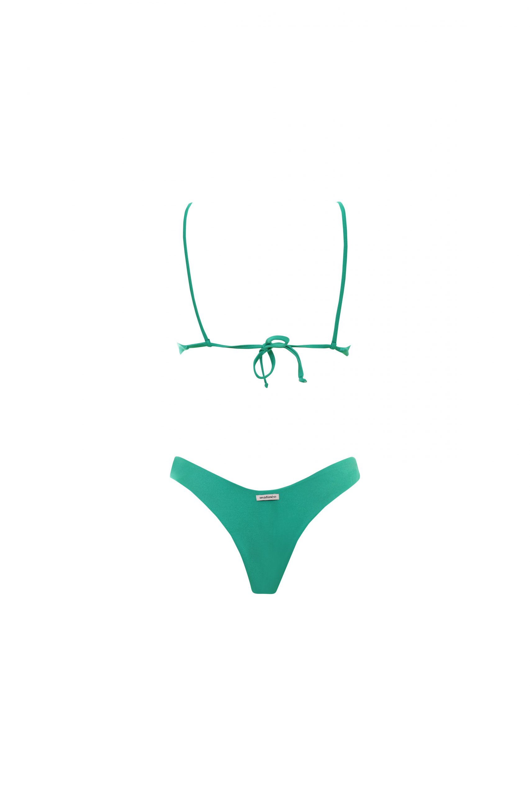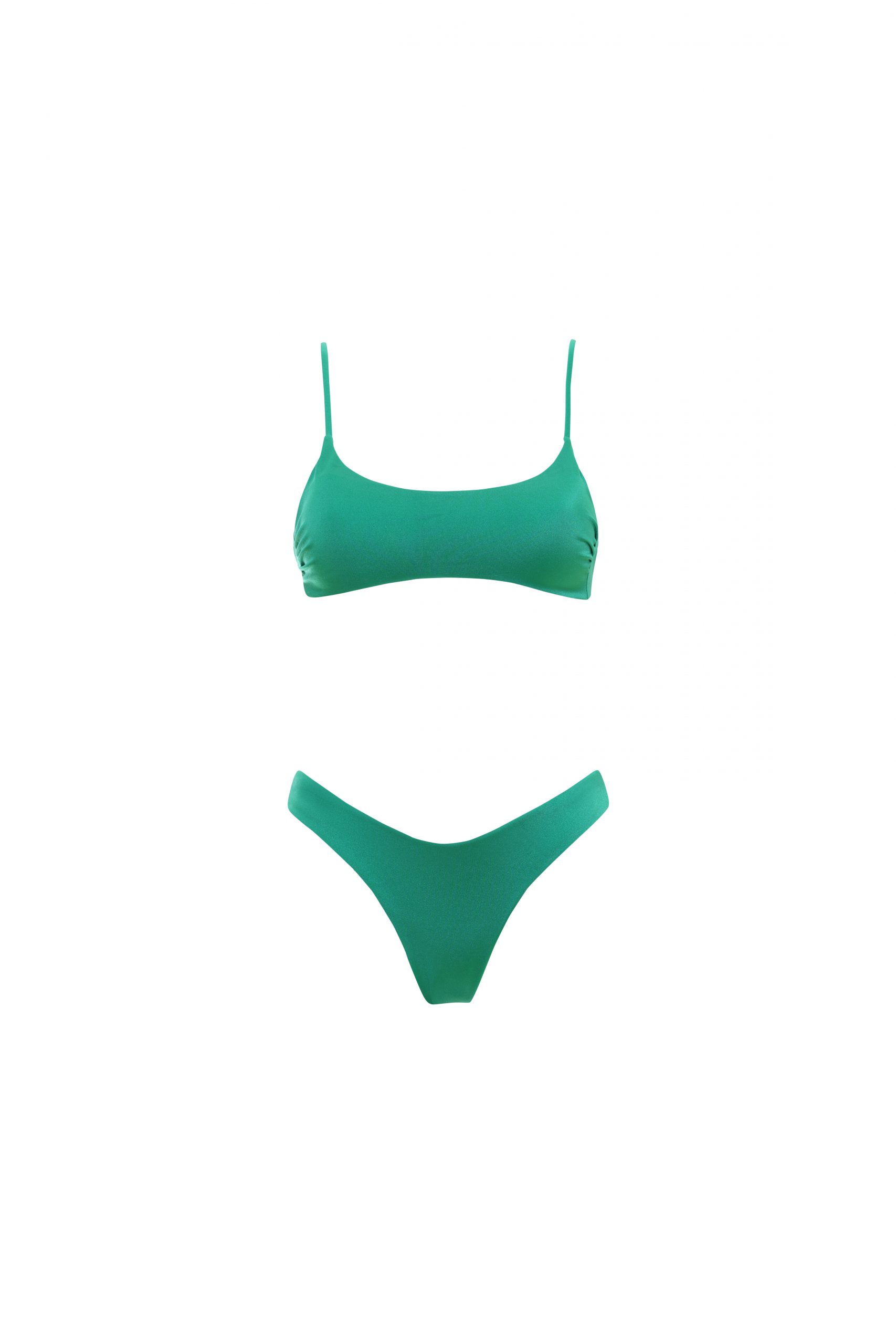 Dora è il bikini che combina un top a fascia con imbottitura estraibile, e uno slip a brasiliana con taglio a V. La chiusura del top è regolabile, grazie ai laccetti annodabili, per garantirti il massimo della personalizzazione. In tinta unita di colore verde. Realizzato in lycra lucida, per un look elegante e luminoso.