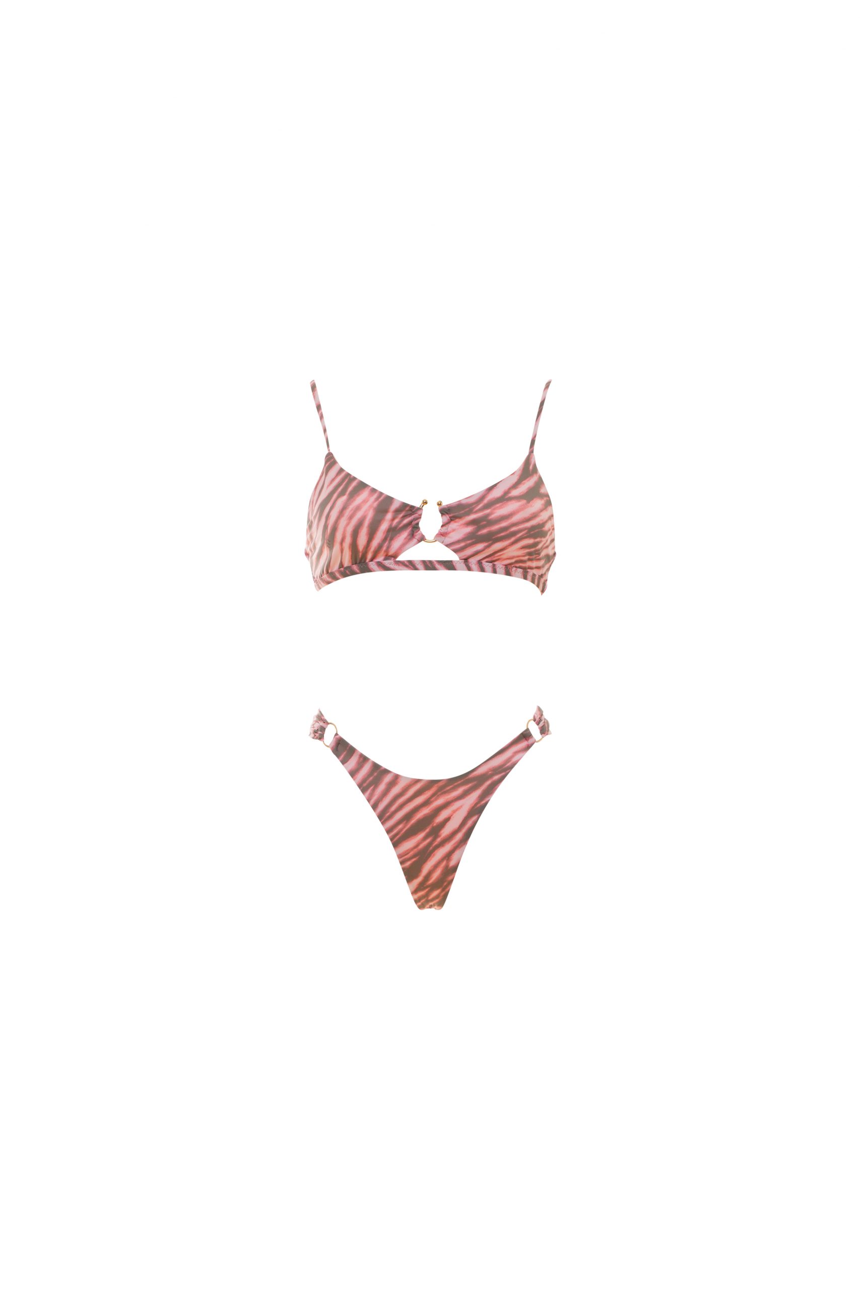 Federica è il bikini che combina un top con bretelle sottili e regolabili e slip con sgambatura a brasiliana e elastico laterale che abbraccia il tuo corpo senza segnare. Gli anelli dorati al centro del top e ai lati dello slip aggiungono al bikini un carattere particolare e uno stile inconfondibile. In fantasia zebrato di colore rosa, per look selvaggi e trendy. Realizzato in microfibra, un tessuto leggero e resistente, perfetto per costumi da bagno confortevoli.