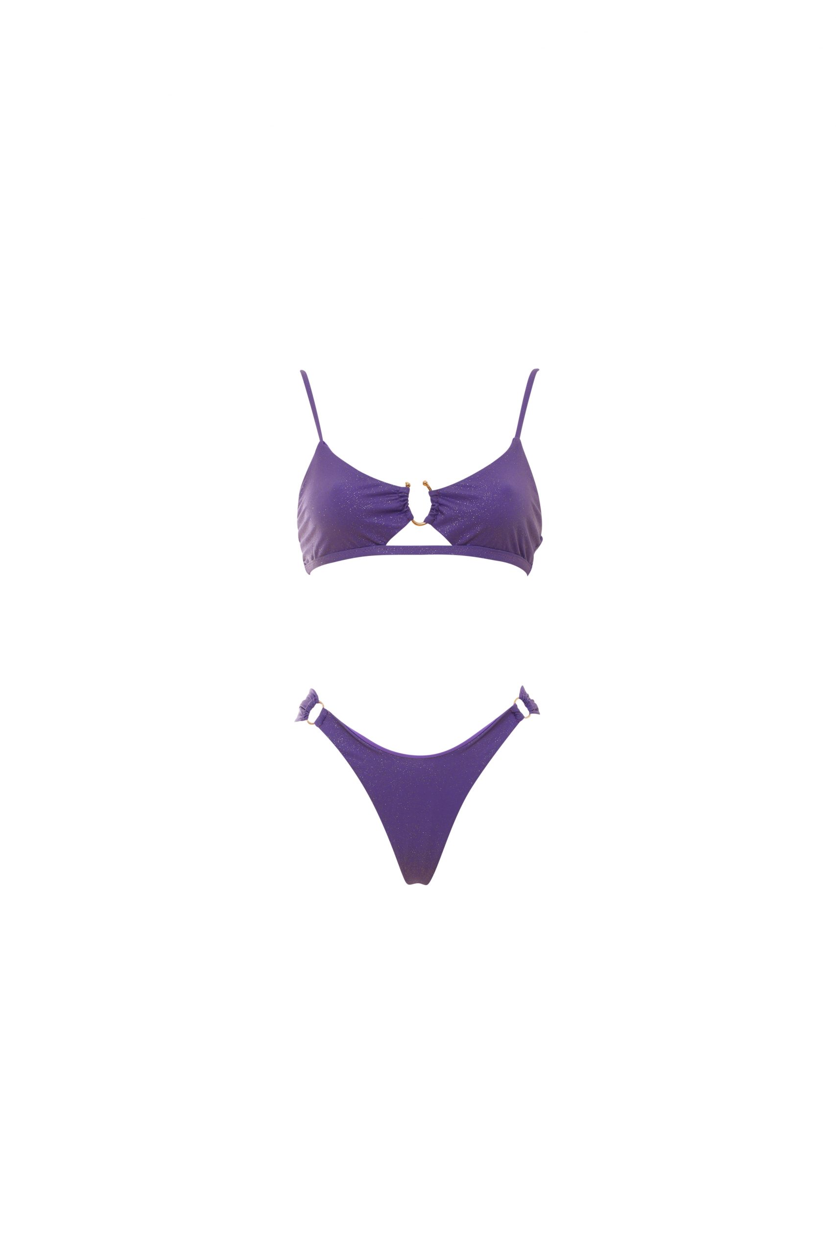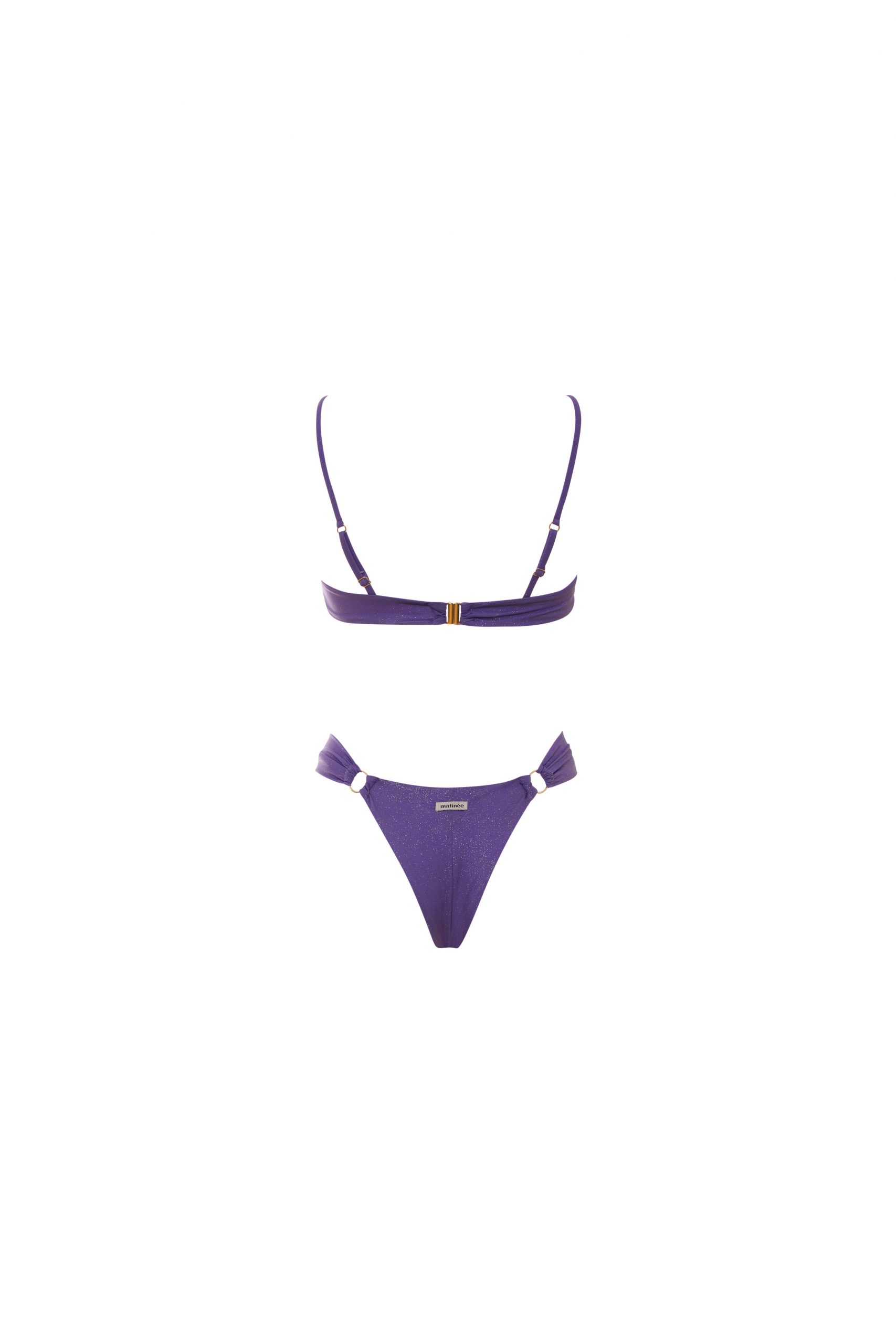 Federica è il bikini che combina un top con bretelle sottili e regolabili e slip con sgambatura a brasiliana e elastico laterale che abbraccia il tuo corpo senza segnare. Gli anelli dorati al centro del top e ai lati dello slip aggiungono al bikini un carattere particolare e uno stile inconfondibile. In tinta unita di colore viola. Realizzato in microfibra kristal, brillantezza e raffinatezza in un tessuto unico per look glamour.