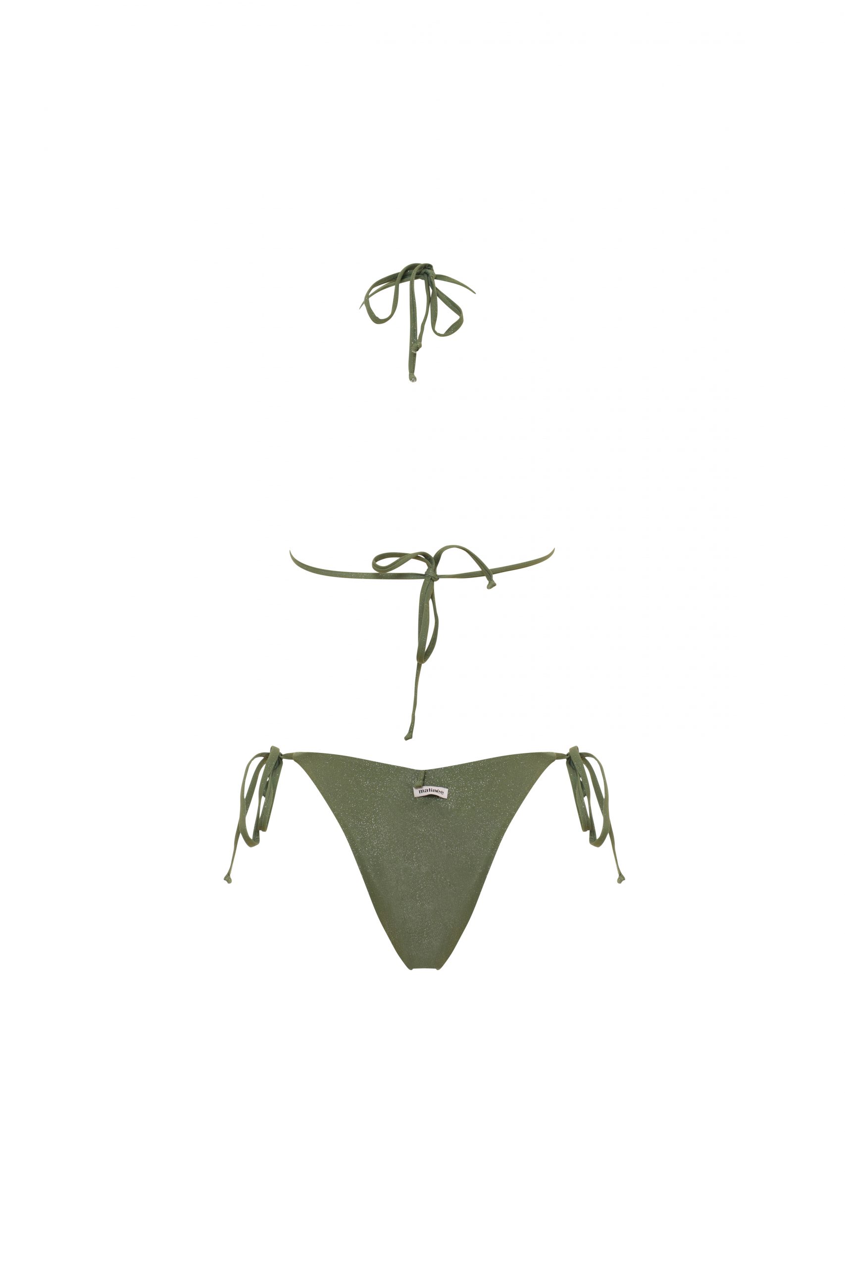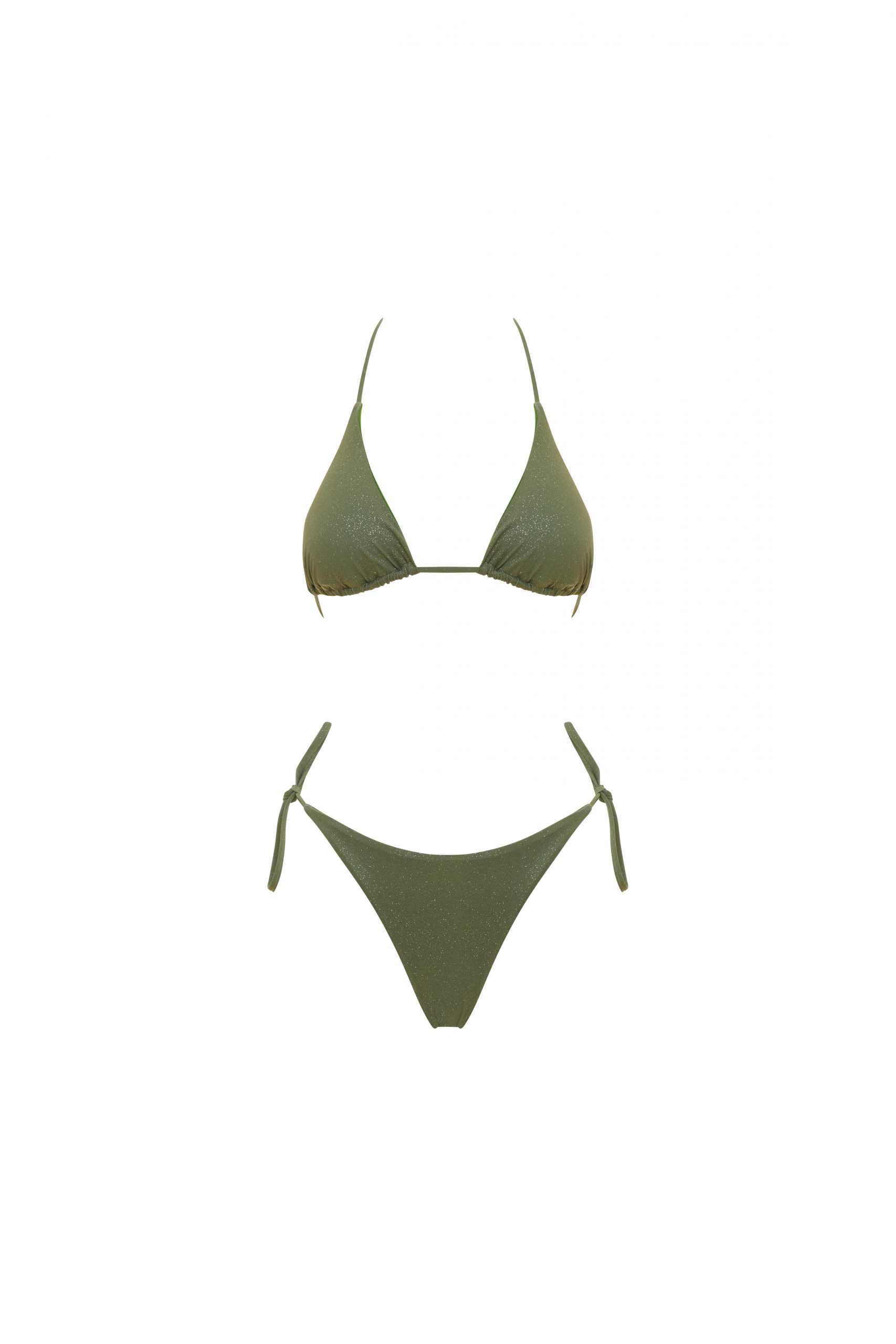 Kate è il bikini must-have dell’estate. Combina un top a triangolo con laccetti regolabili e coppe estraibili e uno slip, anch’esso con laccetti regolabili laterali e una sgambatura a brasiliana. Realizzato in microfibra kristal, brillantezza e raffinatezza in un tessuto unico per look glamour. In tinta unita di colore verde.