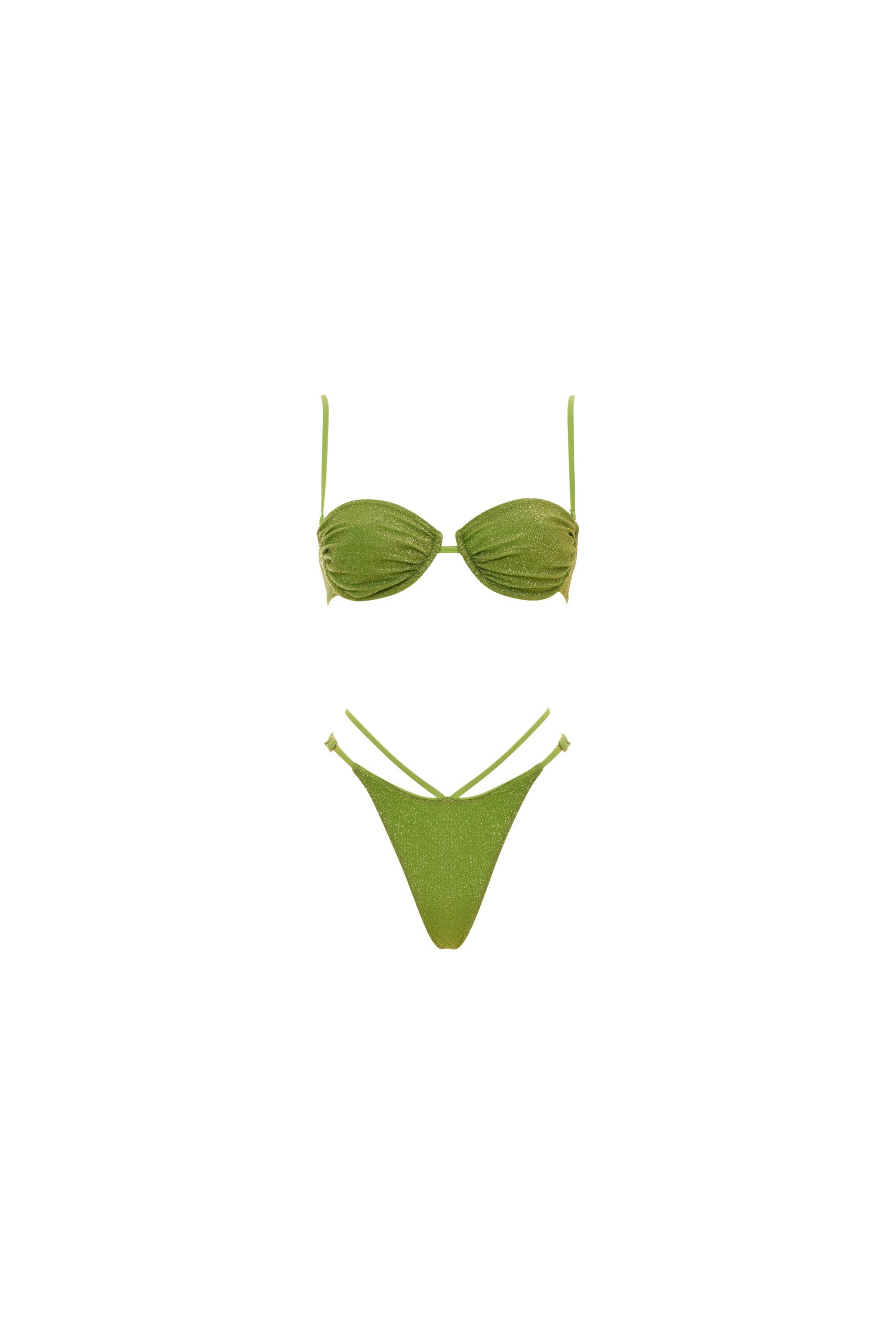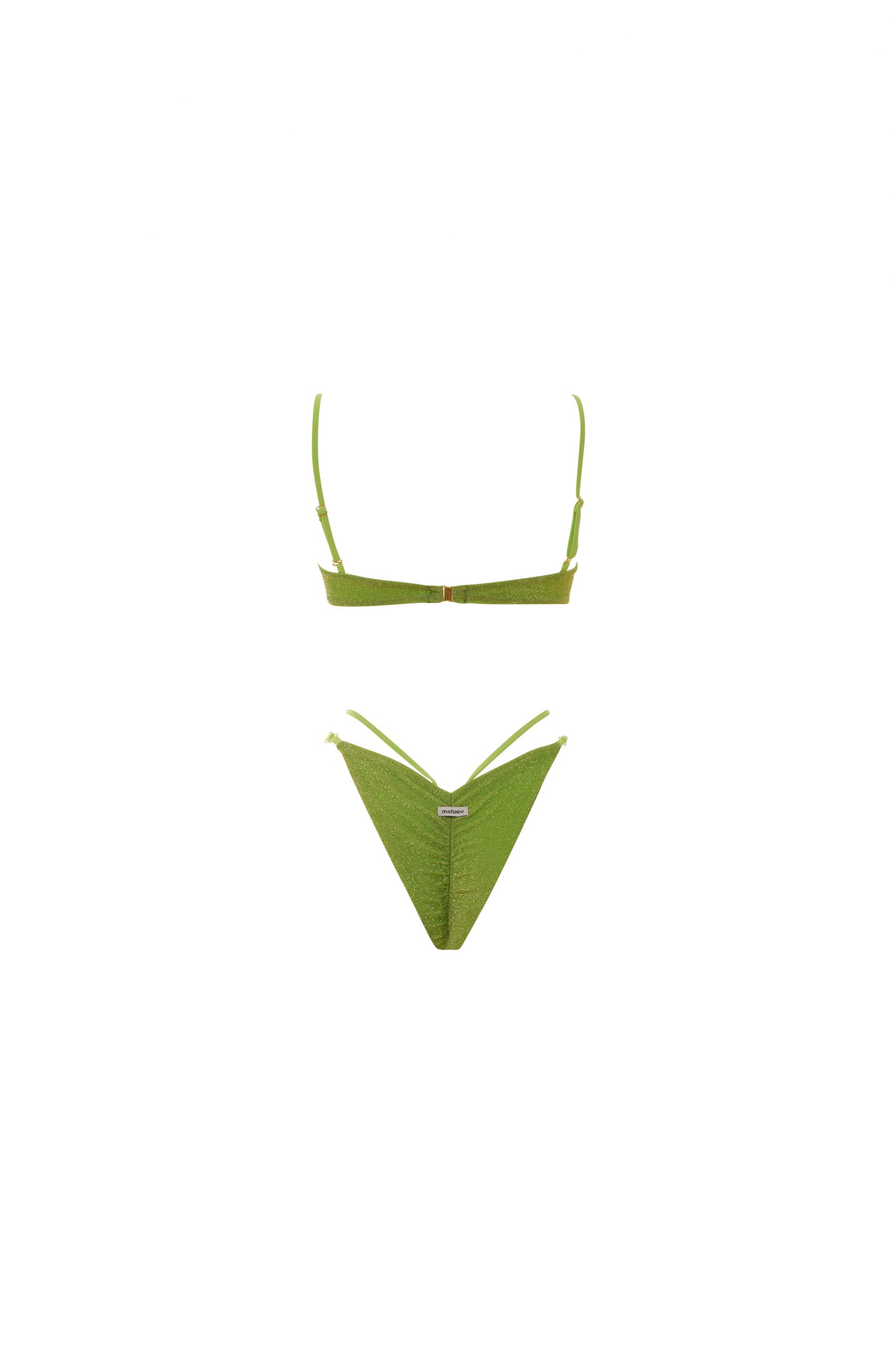 Marina è il bikini bestseller dell’estate, per uno stile impeccabile e luminoso. Combina un top dalla vestibilità slim, con ferretto senza imbottitura e bretelle regolabili e removibili, che ti permette di adattarlo alle tue necessità. E uno slip sgambato con arricciatura sul retro e doppio laccetto. La chiusura del top è con clip, sicura e comoda. Il tessuto in lurex elasticizzato è il giusto compromesso per brillare con il migliore comfort. In tinta unita di colore verde. La modella indossa una taglia S. È alta 175 cm, misura 78 cm di busto, 59 cm di vita e 90 cm di fianchi. Istruzioni per la cura: Lavare a mano in acqua fredda.