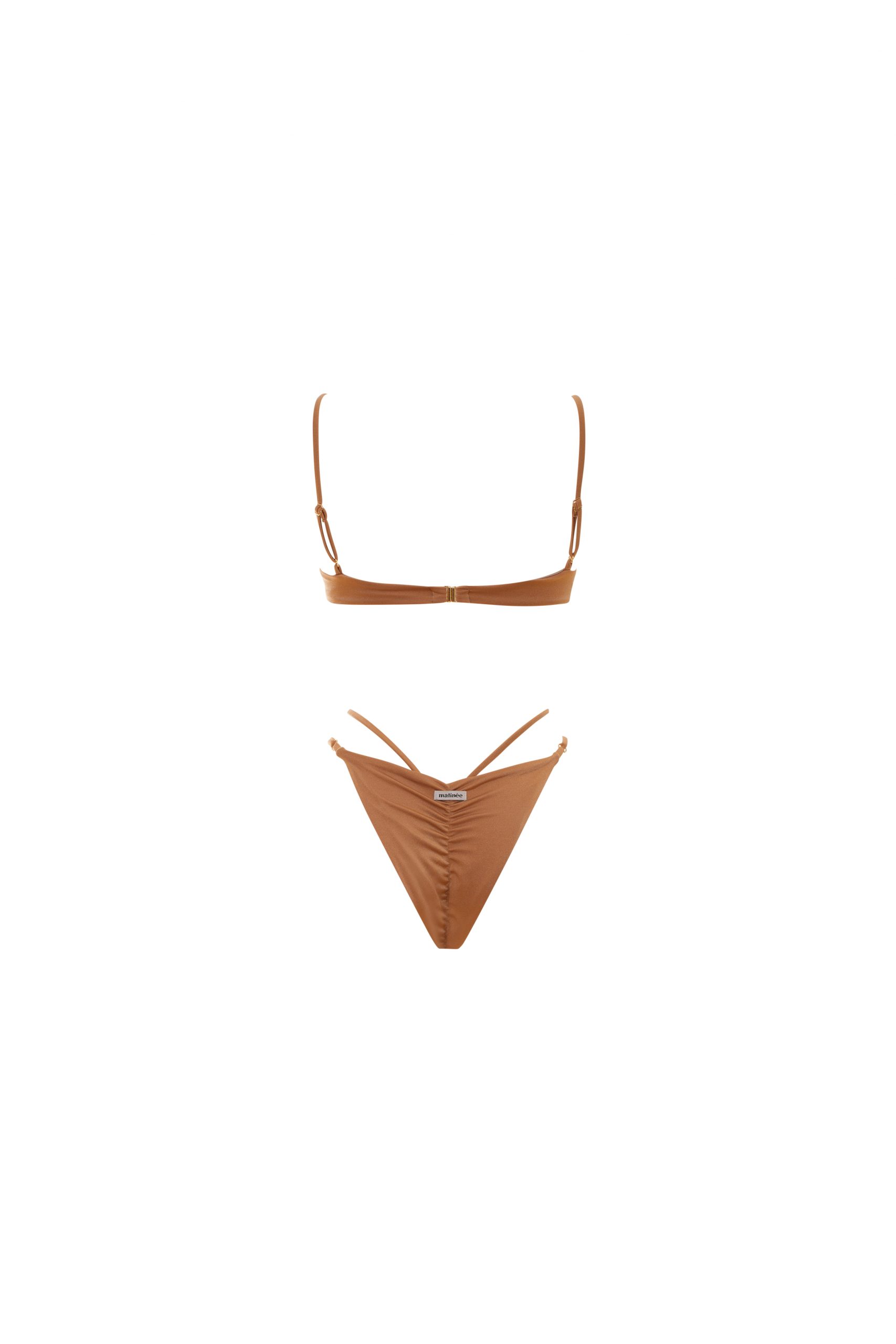 Marina è il bikini bestseller dell’estate, per uno stile impeccabile e luminoso. Combina un top dalla vestibilità slim, con ferretto senza imbottitura e bretelle regolabili e removibili, che ti permette di adattarlo alle tue necessità. E uno slip sgambato con arricciatura sul retro e doppio laccetto. La chiusura del top è con clip, sicura e comoda. Realizzato in lycra lucida con applicazioni in strass, per un look scintillante ed elegante. In tinta unita nella colorazione pampas. La modella indossa una taglia S. È alta 175 cm, misura 78 cm di busto, 59 cm di vita e 90 cm di fianchi. Istruzioni per la cura: Lavare a mano in acqua fredda.