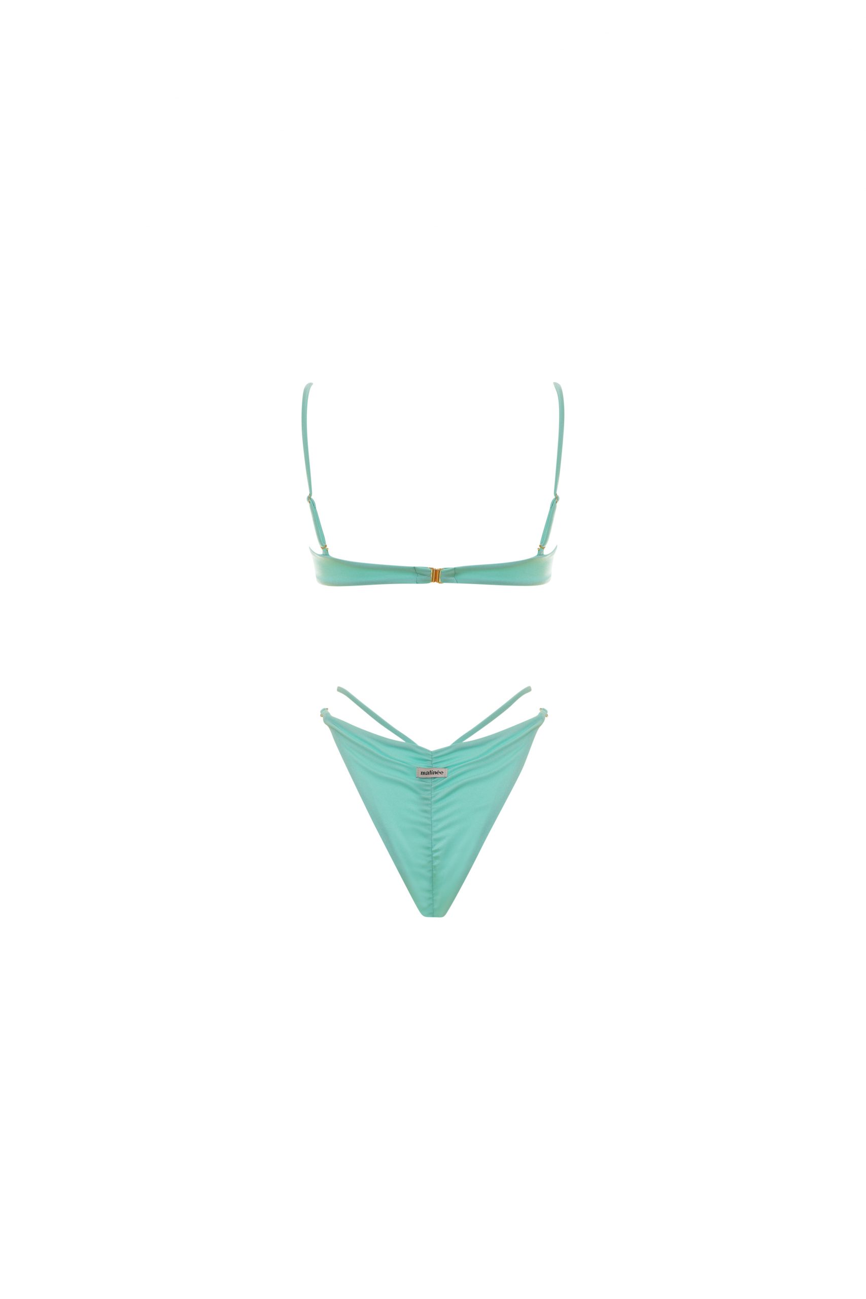 Marina è il bikini bestseller dell’estate, per uno stile impeccabile e luminoso. Combina un top dalla vestibilità slim, con ferretto senza imbottitura e bretelle regolabili e removibili, che ti permette di adattarlo alle tue necessità. E uno slip sgambato con arricciatura sul retro e doppio laccetto. La chiusura del top è con clip, sicura e comoda. Realizzato in lycra lucida con applicazioni in strass, per un look scintillante ed elegante. In tinta unita nella colorazione verde acqua. La modella indossa una taglia S. È alta 175 cm, misura 78 cm di busto, 59 cm di vita e 90 cm di fianchi. Istruzioni per la cura: Lavare a mano in acqua fredda.