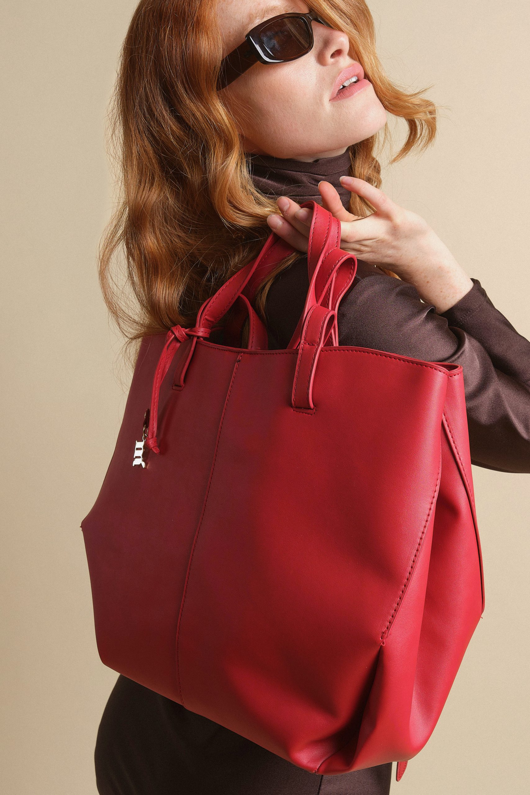 Shopper ventaglio di colore rosso, capiente con chiusura a bottone e doppio manico. Perfetta per trasportare tutto ciò che ti serve con stile, unendo praticità e design di tendenza per i tuoi look quotidiani. In eco-pelle.