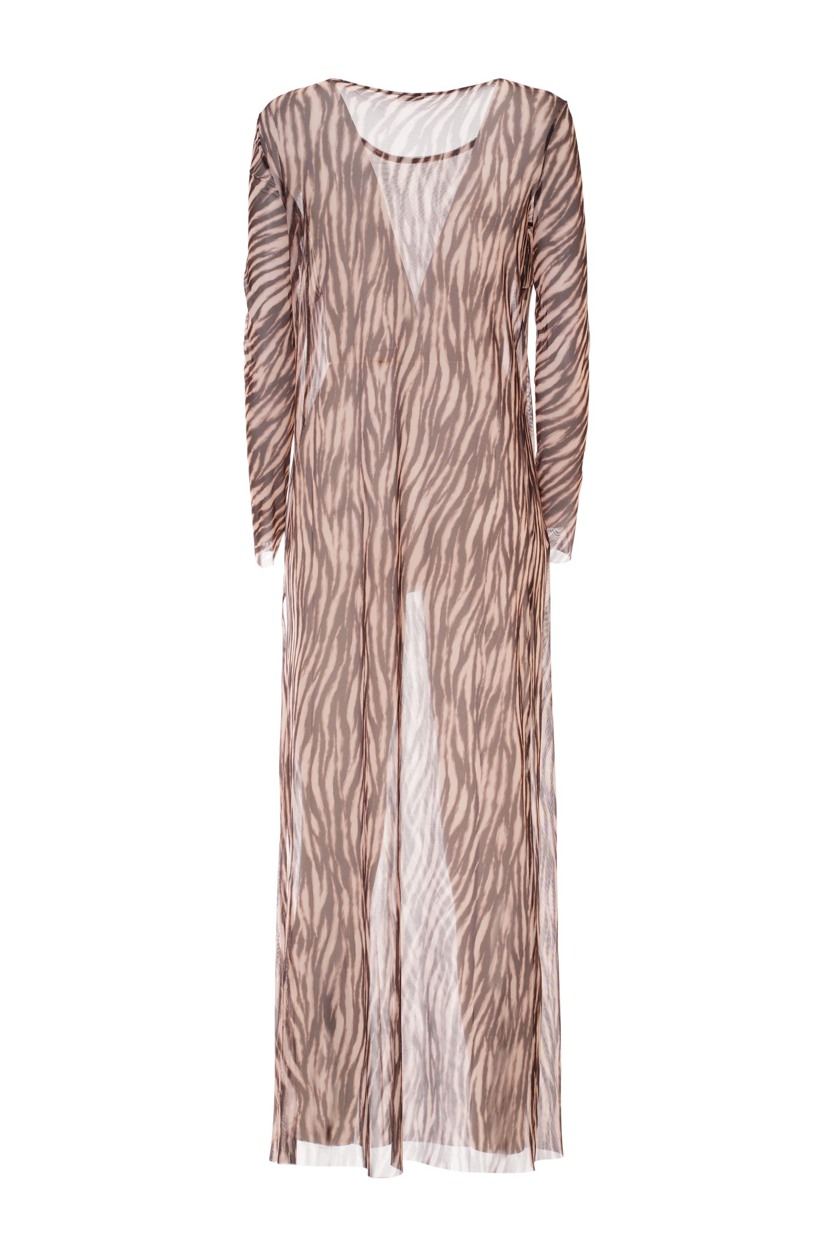 Selene è l’abito con manica lunga e trasparenze, perfetto per creare un look glamour per le tue giornate estive, al mare, in piscina o in barca. Realizzato in tulle, un tessuto leggero e trasparente, per dettagli eleganti e femminili. In fantasia zebrato di colore marrone.