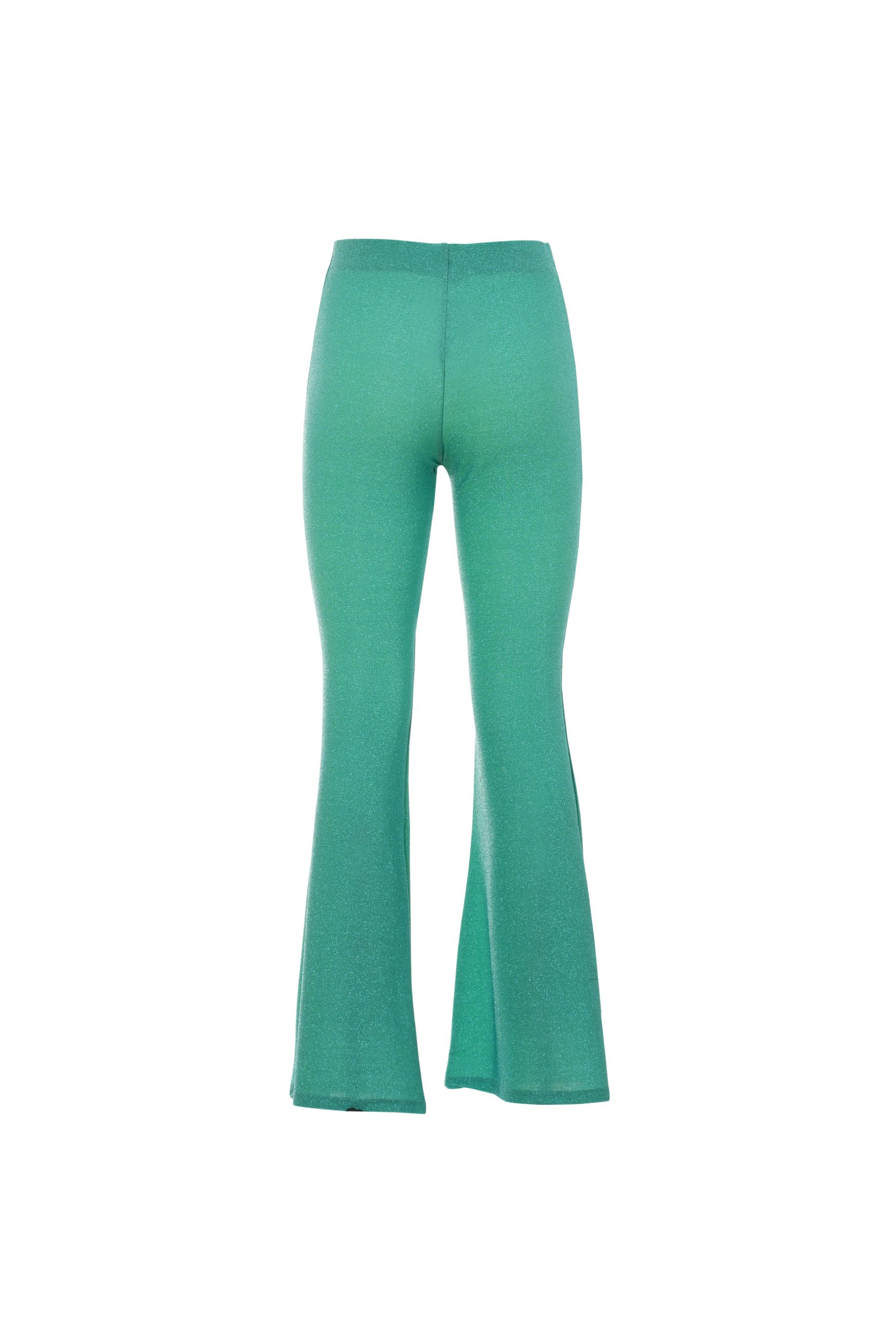 Silvia è il pantalone a zampa perfetto per creare look estivi glamour e alla moda. Realizzato in lurex elasticizzato, il giusto compromesso per brillare con il migliore comfort. In tinta unita, nella colorazione tiffany. Istruzioni per la cura: Lavare a mano in acqua fredda.