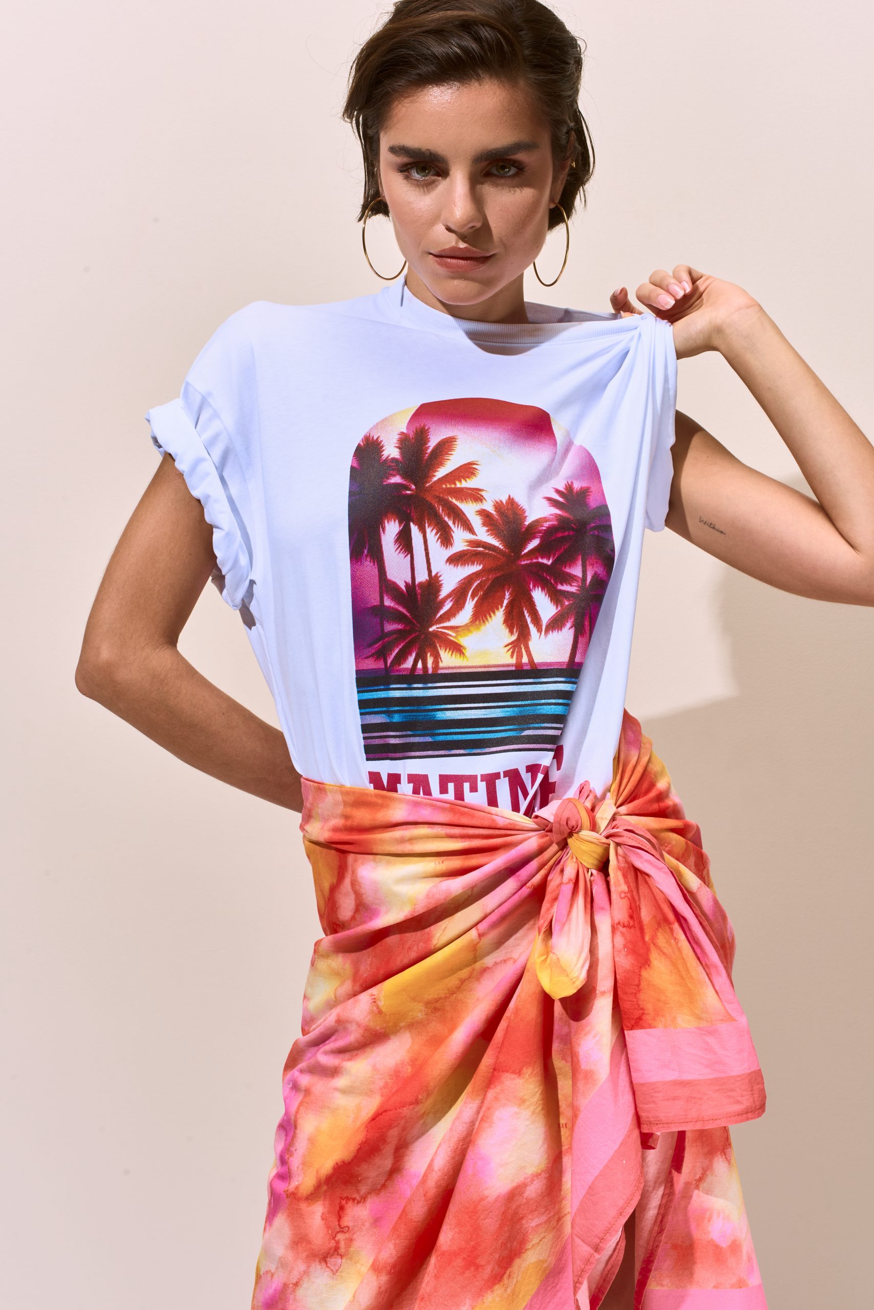 Andrea is the t-shirt Unisex with oversize fit and print on the front. Made of cotton. White coloration.