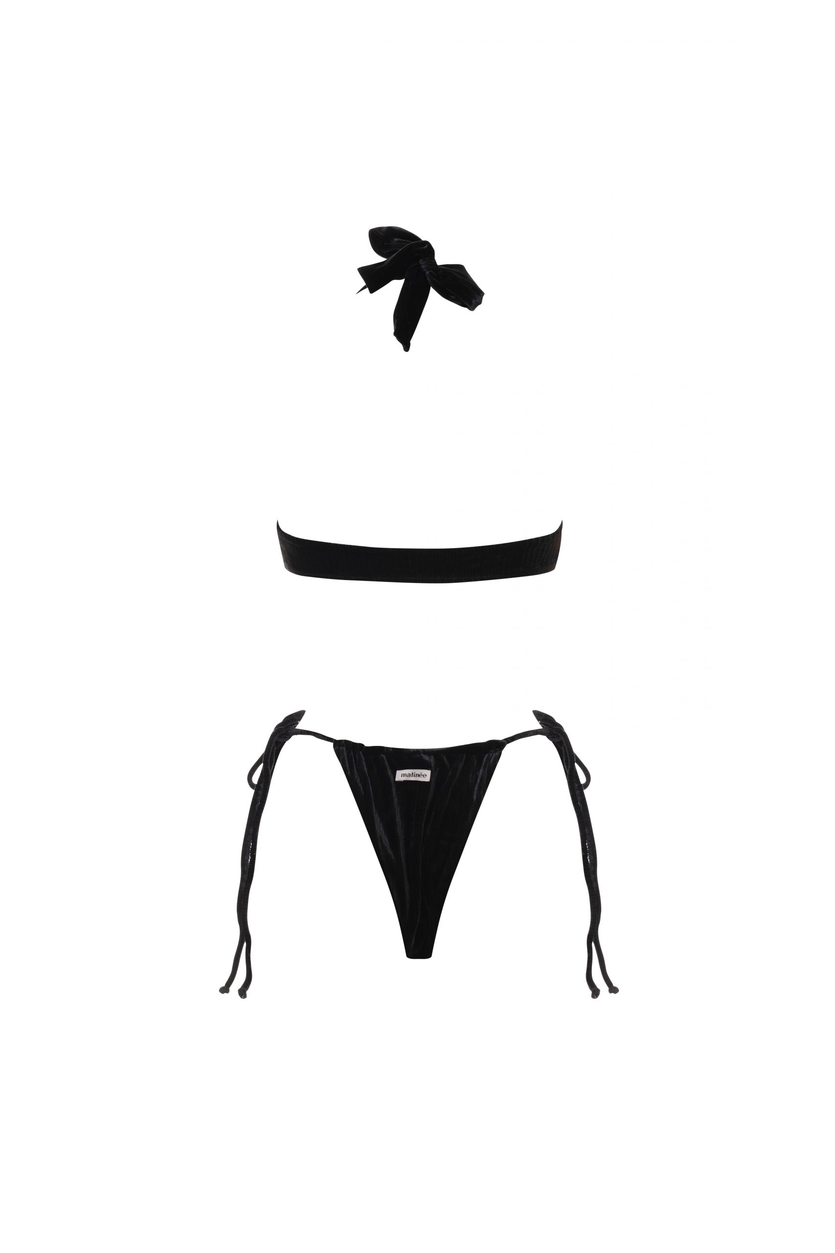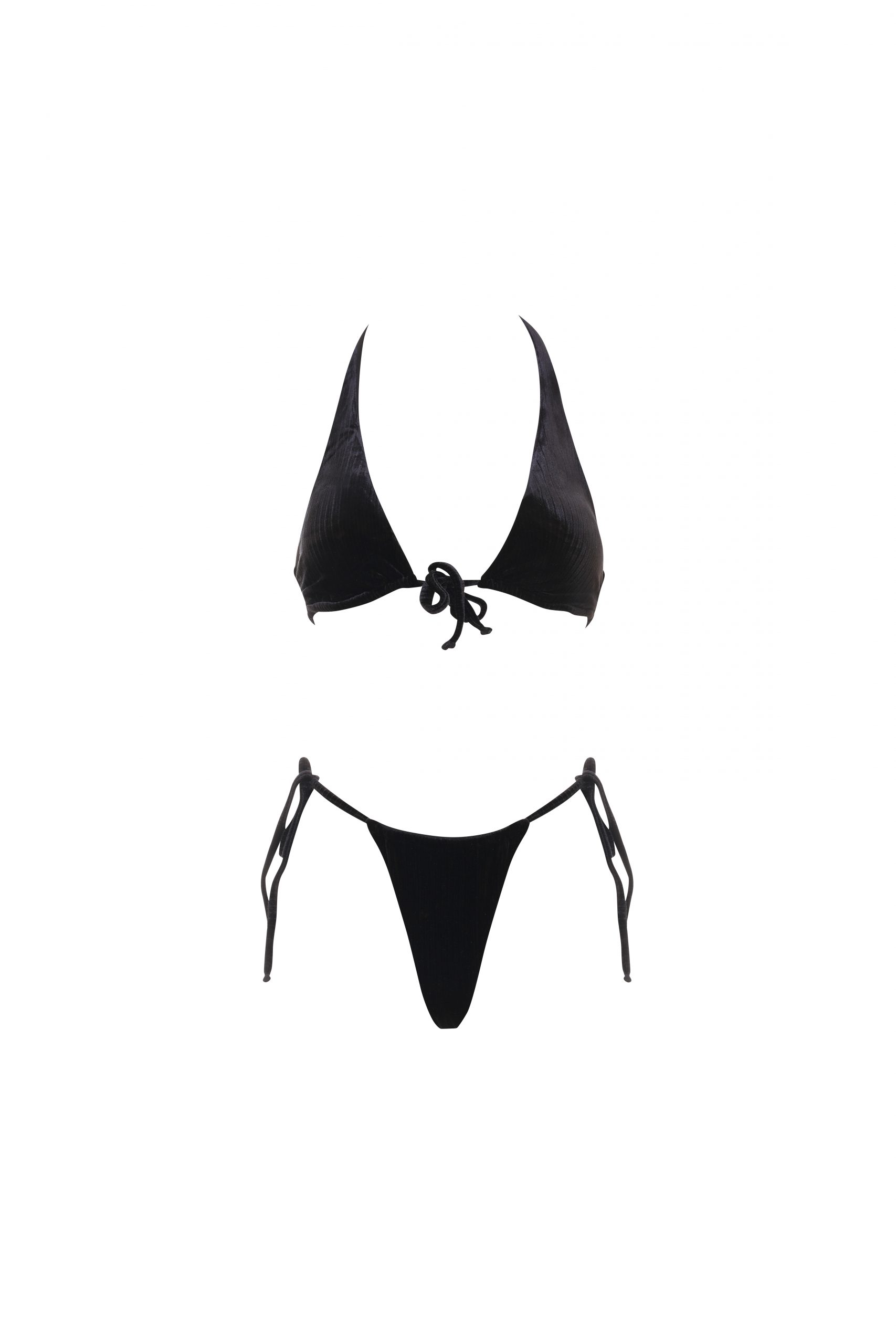 Benedetta is the bikini super trendy that combines a triangle top with front lacing, fixed wide straps and removable cup, with a briefs Brazilian with a minimal fit. The briefs features knotted ties at the hips, allowing you to customize it to fit your silhouette. In solid color black in color. Made of. velvet rib, a soft and comfortable ribbed fabric ideal for a modern and versatile summer look.