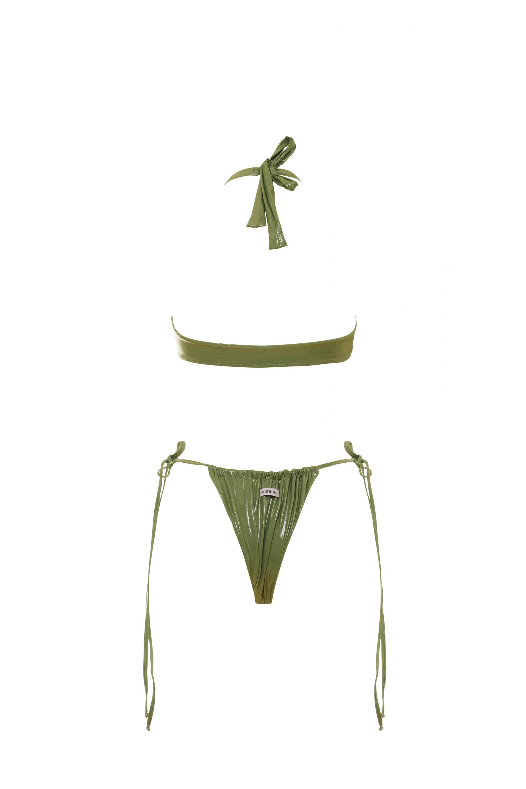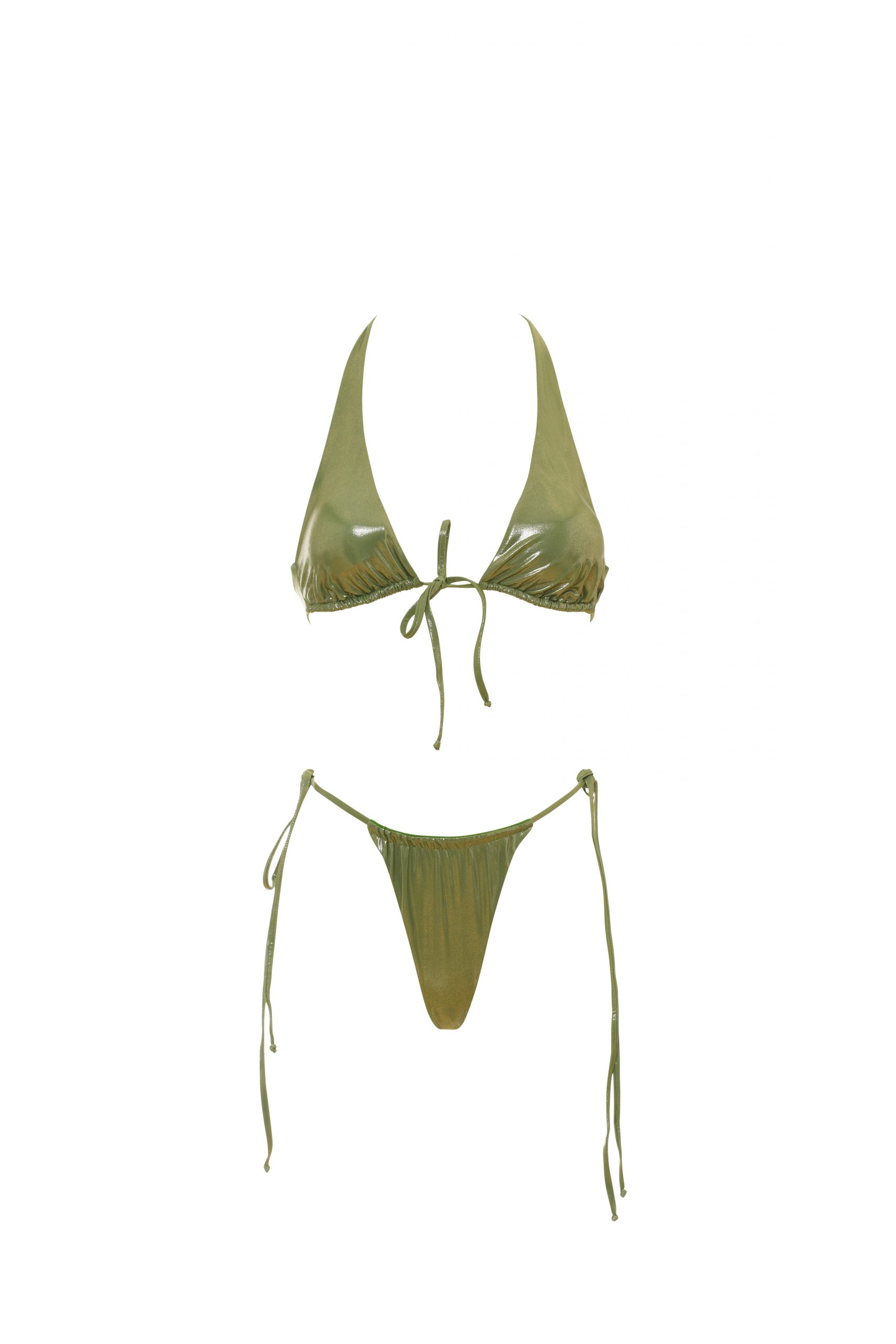 Benedetta is the bikini super trendy that combines a triangle top with front lacing, fixed wide straps and removable cup, with a briefs Brazilian with a minimal fit. The briefs features knotted ties at the hips, allowing you to customize it to fit your silhouette. In solid color green color. Made of foil, a reflective material that adds a glamorous touch to swimwear.