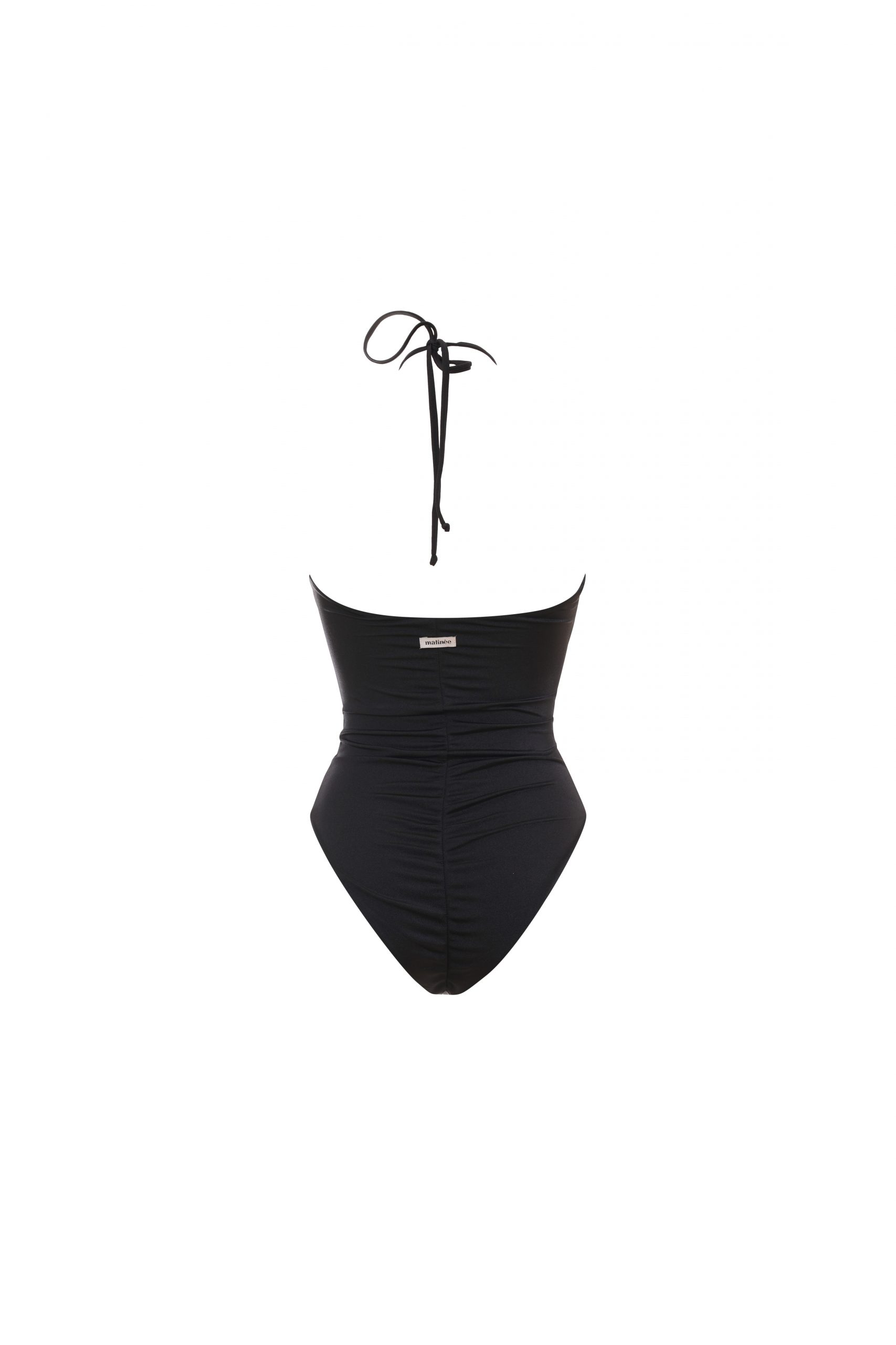 Clio is thewhole Super glamorous with an elegant and distinctive line. It has a plunging neckline on the front with cut out and tie fastening with ties that can be tied behind the neck. The cups are removable, ideal for adapting the fit to your style. The neckline on the back is straight while the leg length is brazilian. In solid color black in color. Made of. glossy lycra, for an elegant and bright look.