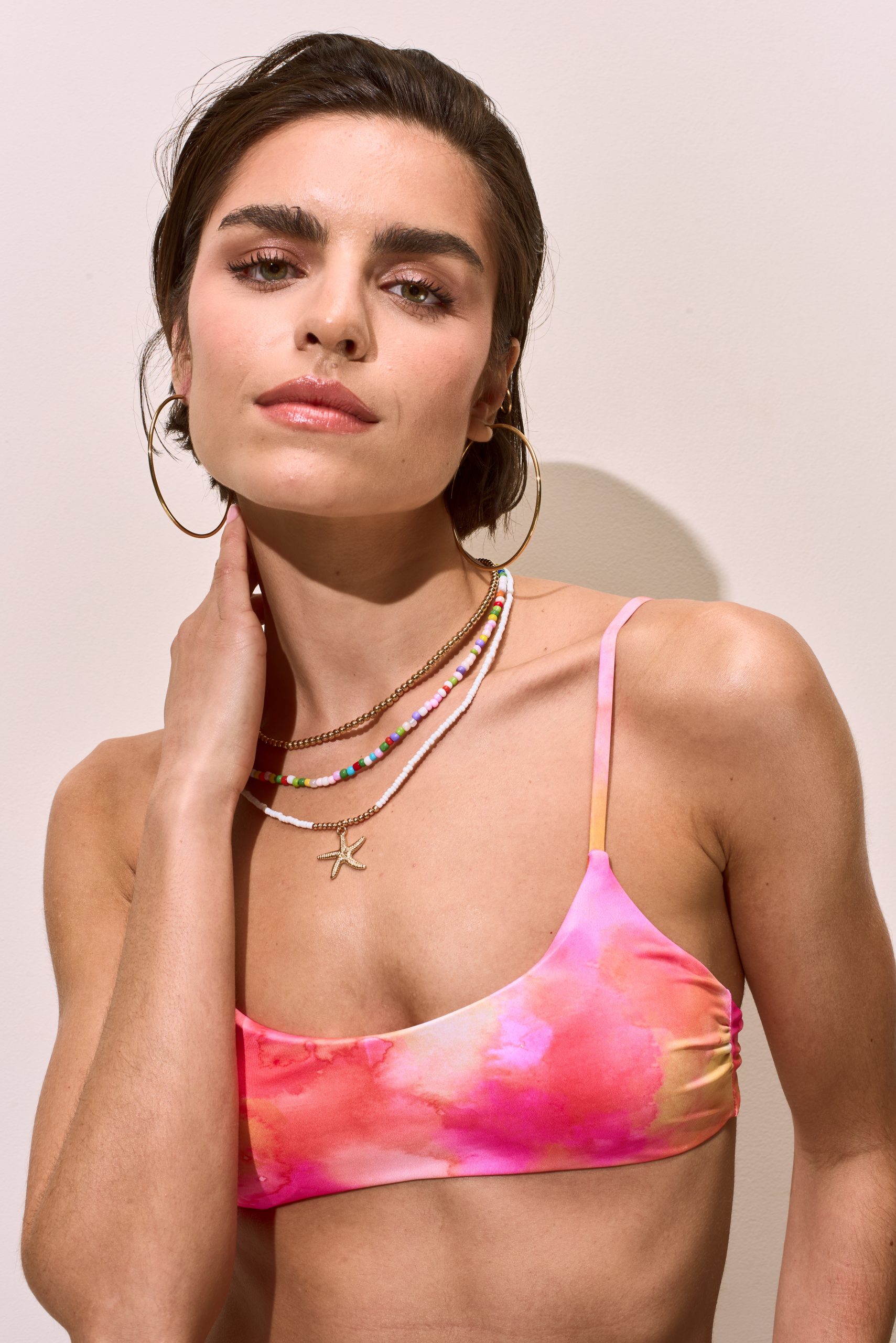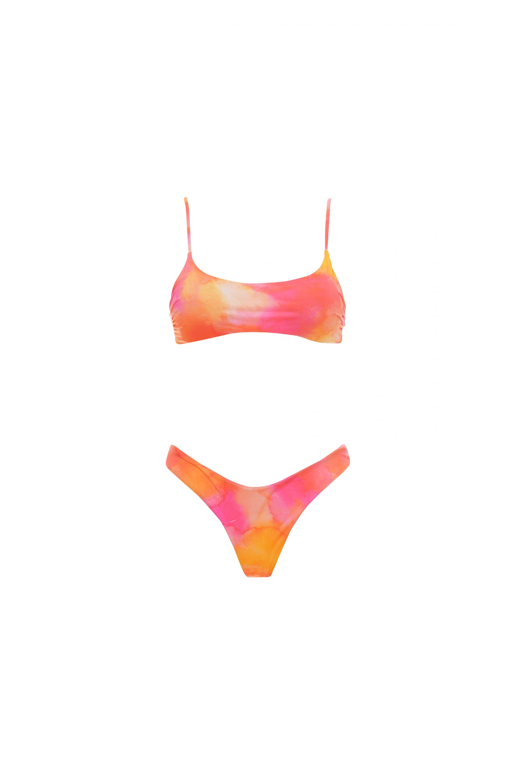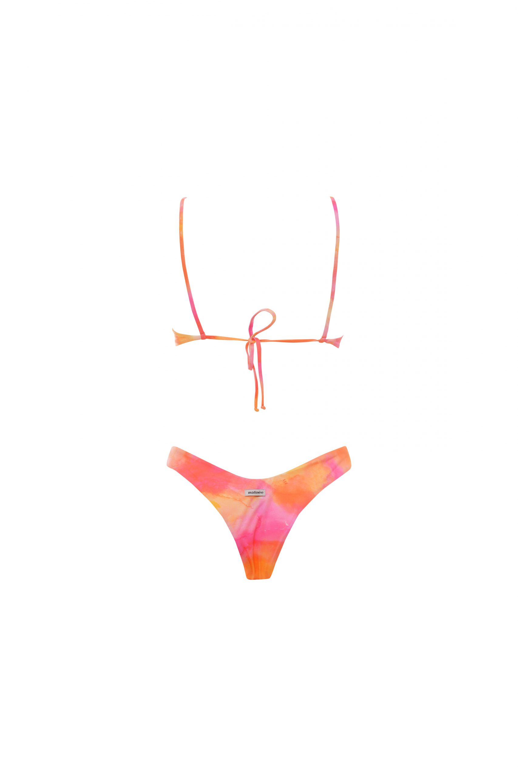 Dora is the bikini which combines a bandeau top with removable padding, and one Brazilian briefs V-cut. The top's closure is adjustable, thanks to knotted ties, to give you the ultimate in customization. In fantasy loose in orange color for fresh and cheerful looks. Made from microfiber, a lightweight and durable fabric perfect for comfortable swimwear.