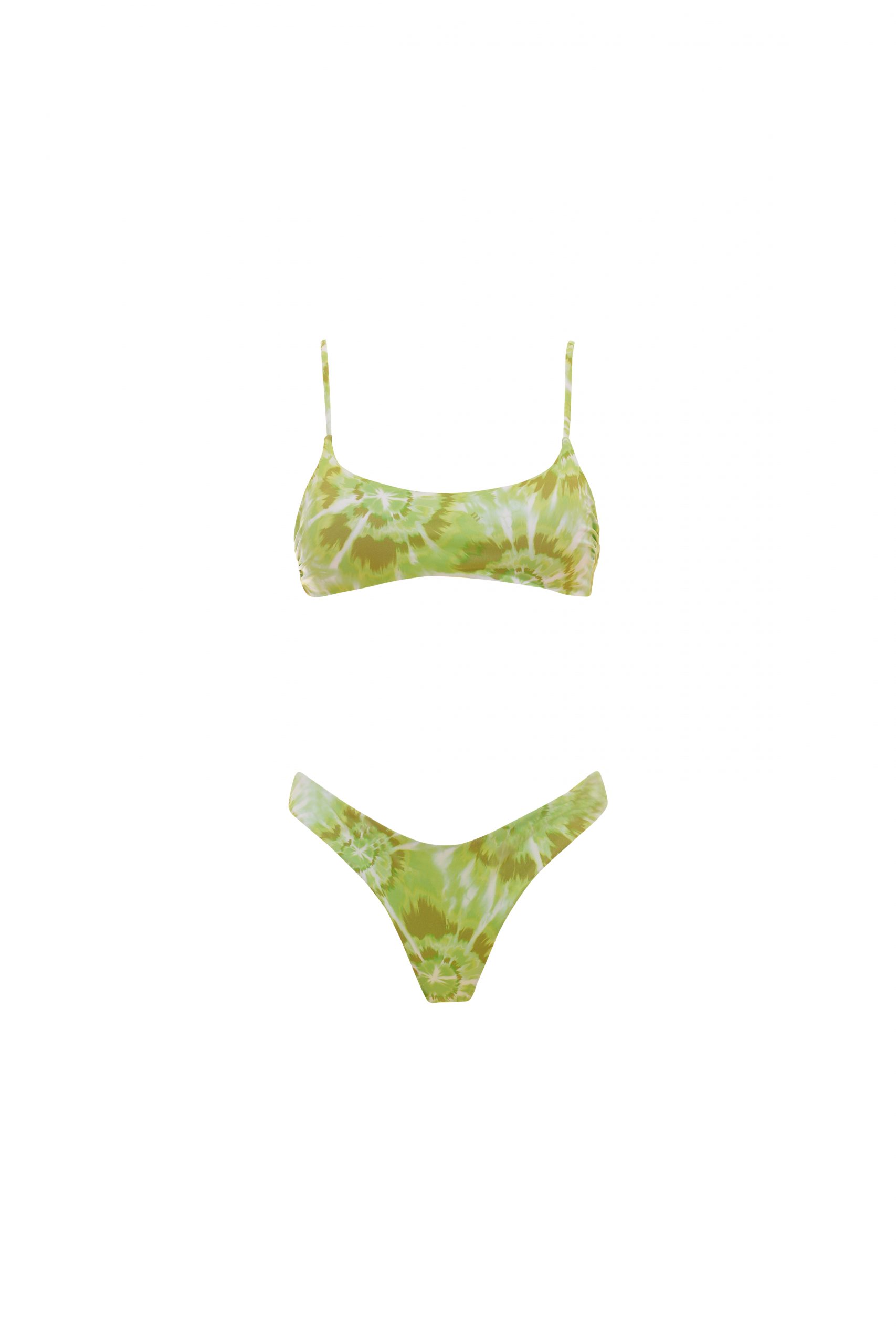 Dora is the bikini which combines a bandeau top with removable padding, and one Brazilian briefs V-cut. The top's closure is adjustable, thanks to knotted ties, to give you the ultimate in customization. In fantasy tie dye in green color. Made of microfiber, a lightweight and durable fabric perfect for comfortable swimwear.