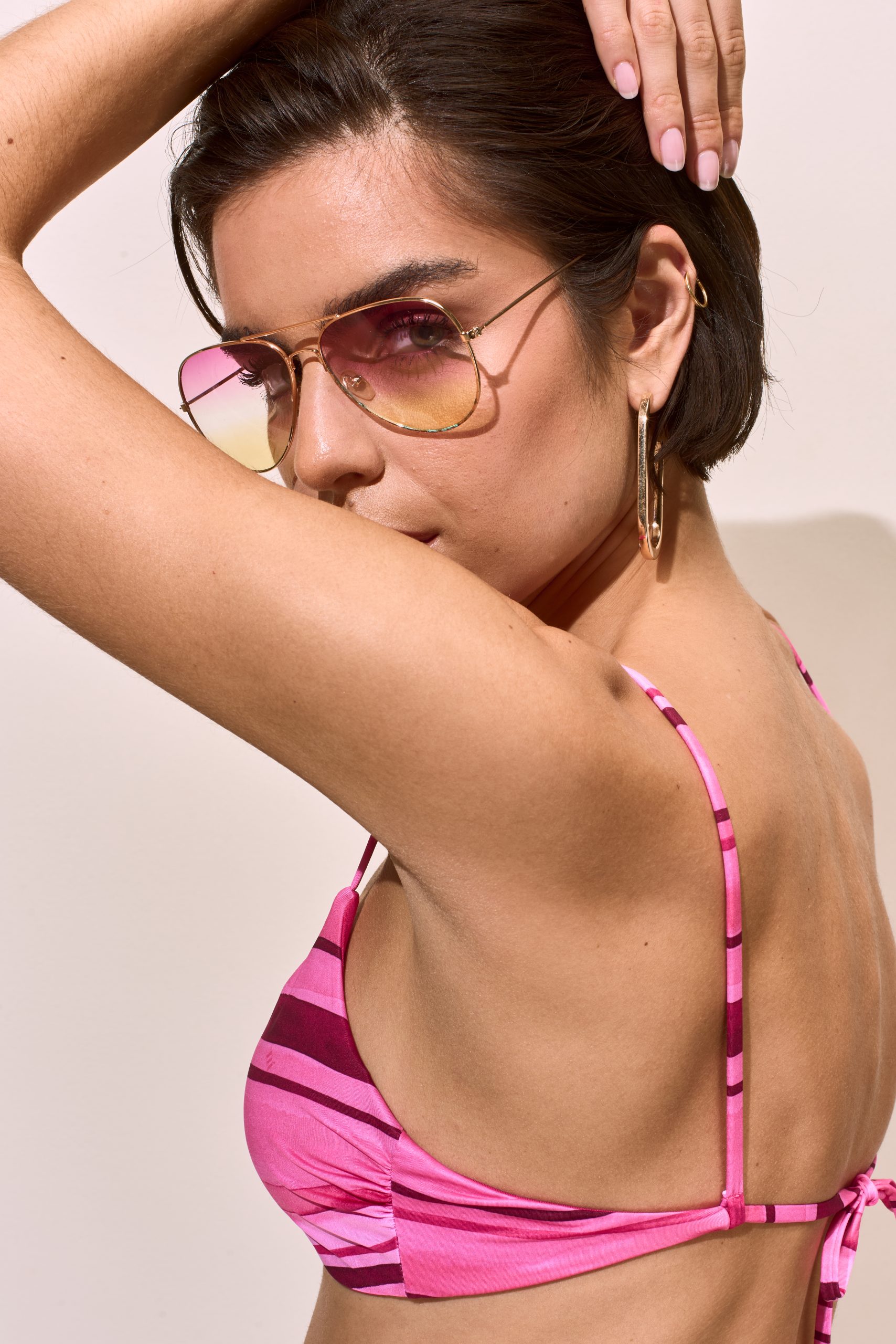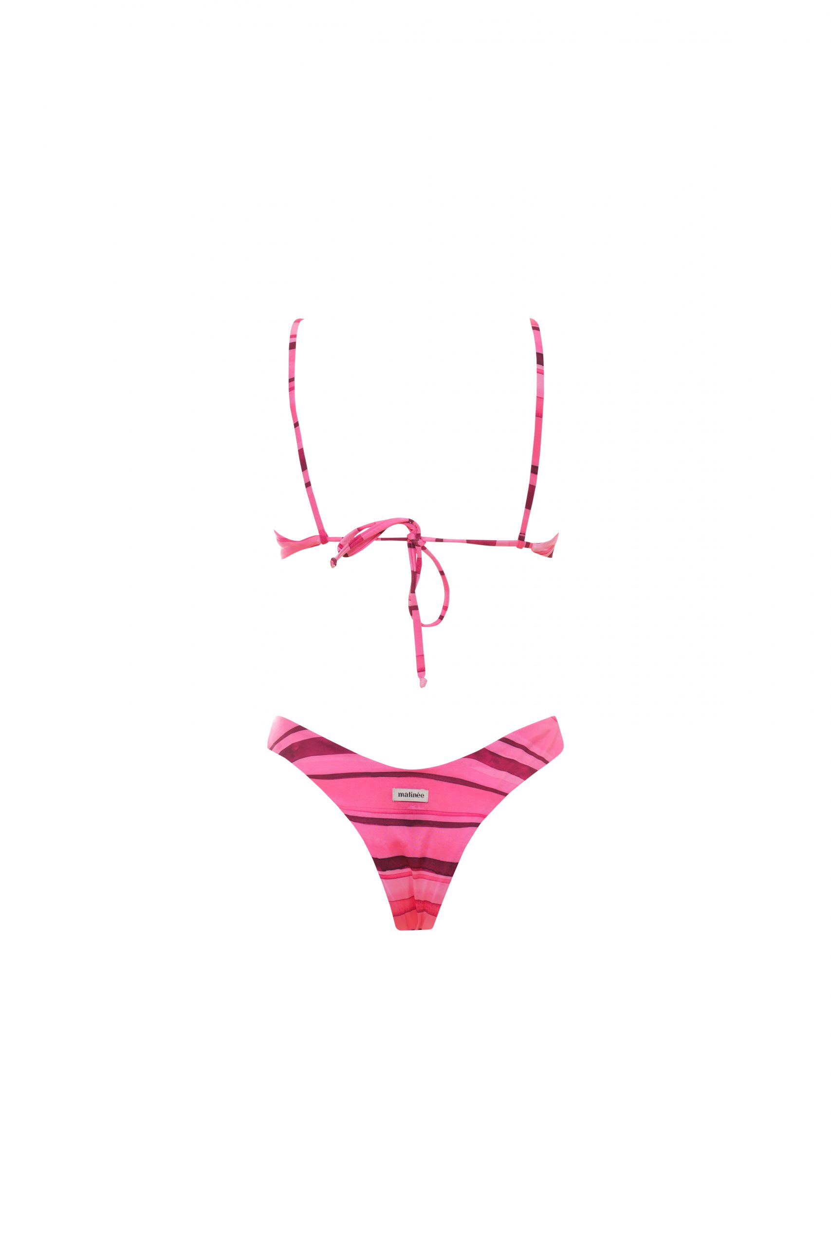 Dora is the bikini which combines a bandeau top with removable padding, and one Brazilian briefs V-cut. The top's closure is adjustable, thanks to knotted ties, to give you the ultimate in customization. In fantasy Tropical in pink color. Made of microfiber, a lightweight and durable fabric perfect for comfortable swimwear.