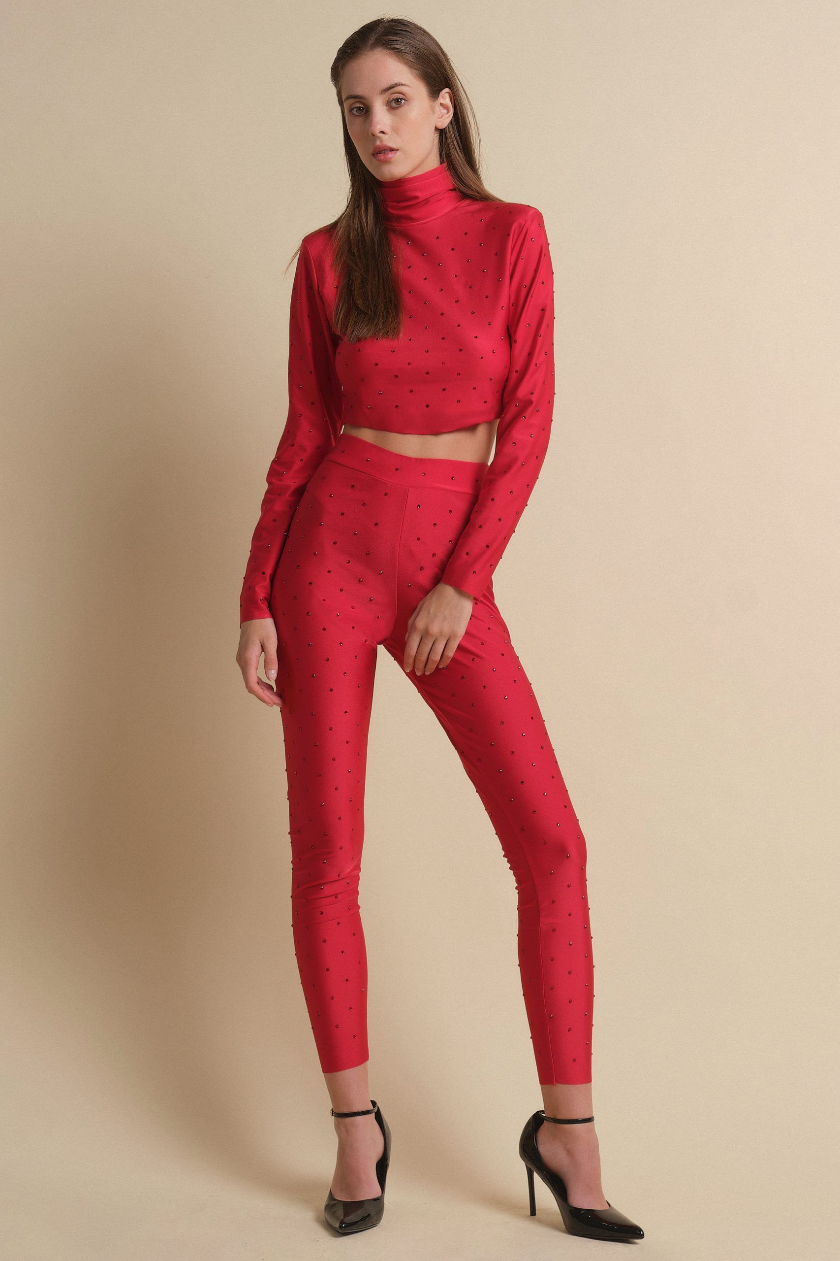 Rhinestone leggings that combine comfort and style, ideal for shining on any occasion without sacrificing comfort. Easy to wear and practical, they require cold hand washing for long lasting durability and brightness. Made of glossy lycra in red color.
