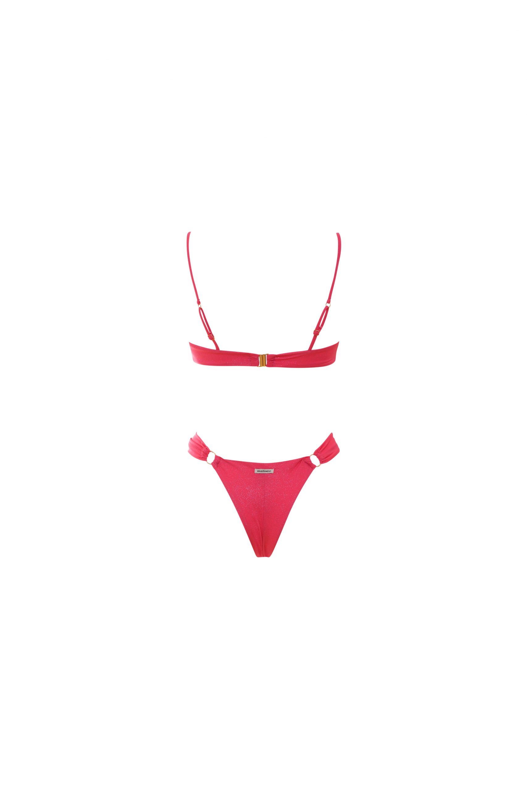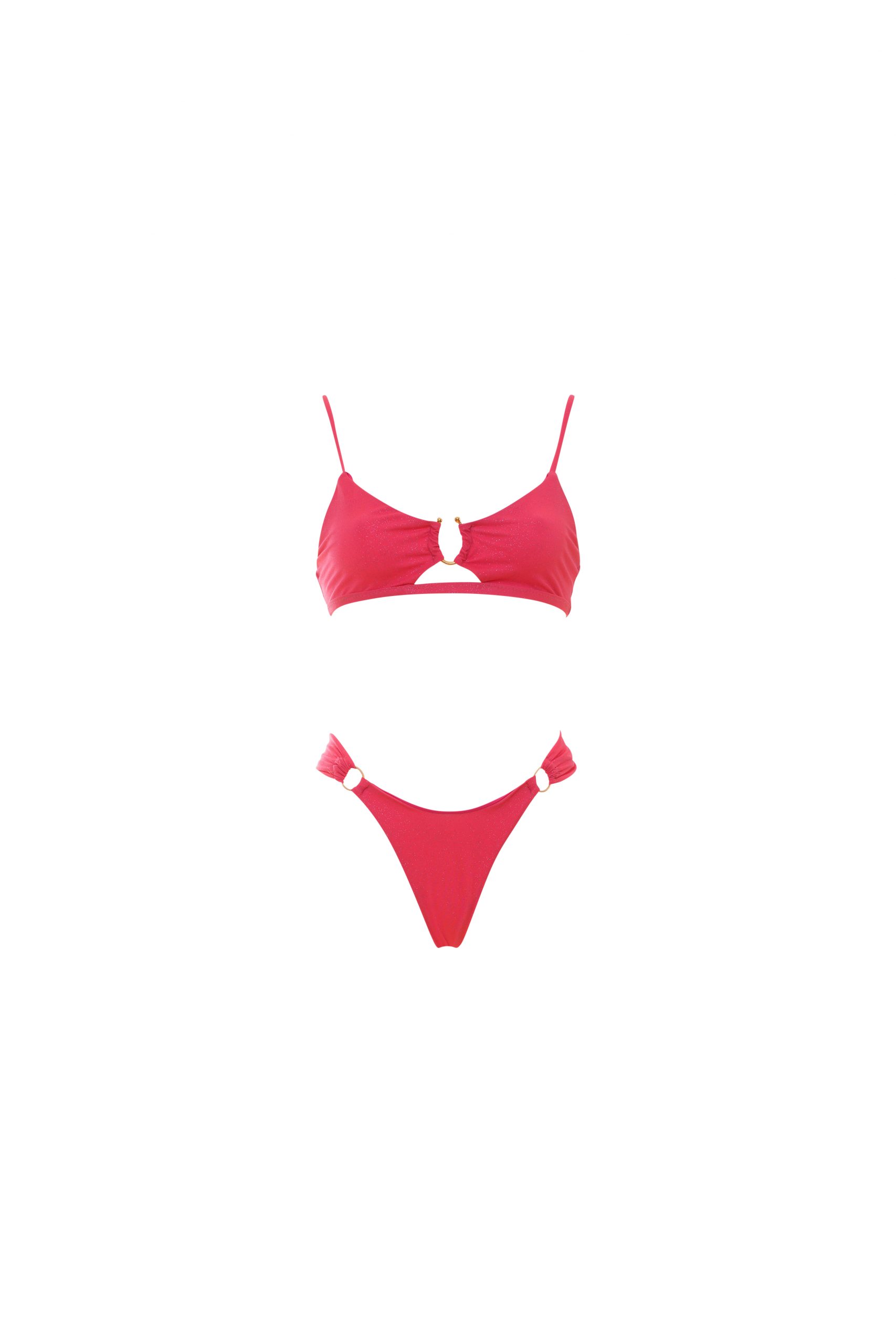 Federica is the bikini which combines a top With thin, adjustable suspenders and briefs with a Brazilian-cut bottom and side elastic that hugs your body without marking. Gold rings in the center of the top and on the sides of the bottom add distinctive character and unmistakable style to the bikini. In solid color, in the color fuchsia. Made of microfiber kristal, brilliance and sophistication in a unique fabric for glamorous looks.