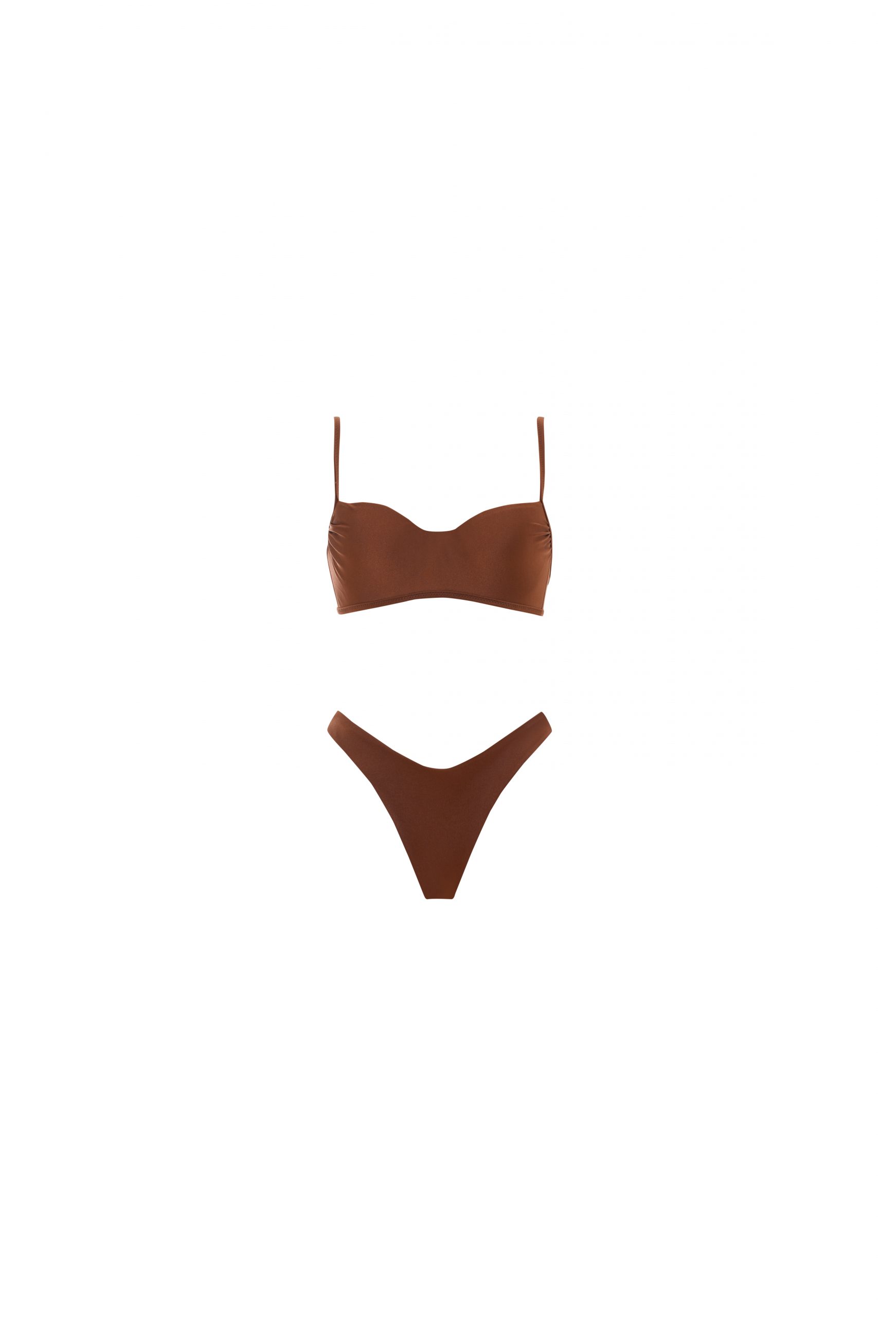 Joy is the bikini feminine and elegant, perfect for your summer days. Its fixed cup top, adjustable shoulder straps and clip closure gives you stability and security customizable to your needs. Lo briefs has a regular fit and a Brazilian. In solid color, in rum coloring. Made of glossy lycra, for an elegant and bright look.