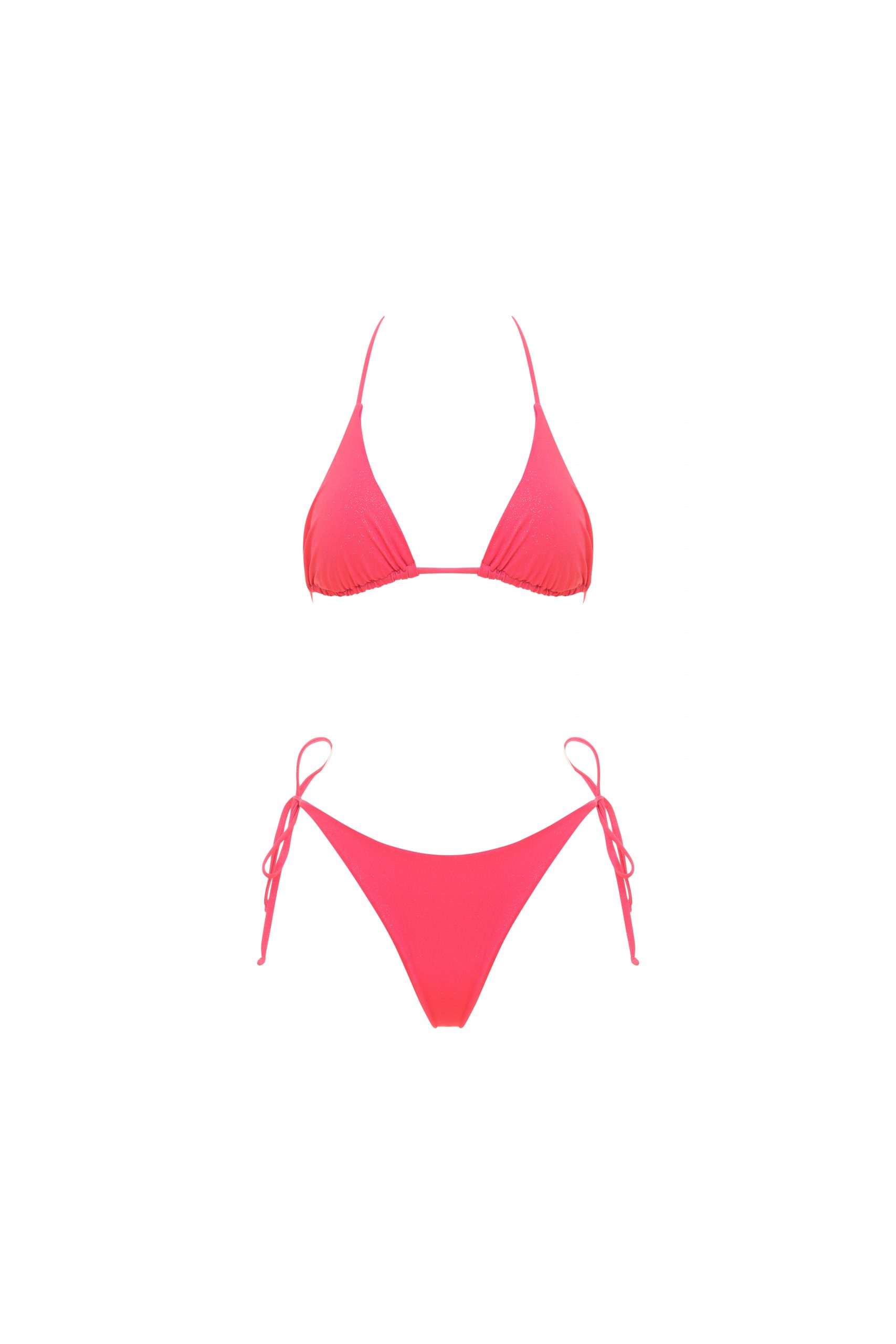 Kate is the must-have bikini of summer. It combines a triangle top with adjustable drawstrings and removable cups and one briefs, also with adjustable side ties and a Brazilian. Made of microfiber kristal, brilliance and sophistication in a unique fabric for glamorous looks. In solid color fuchsia in color.