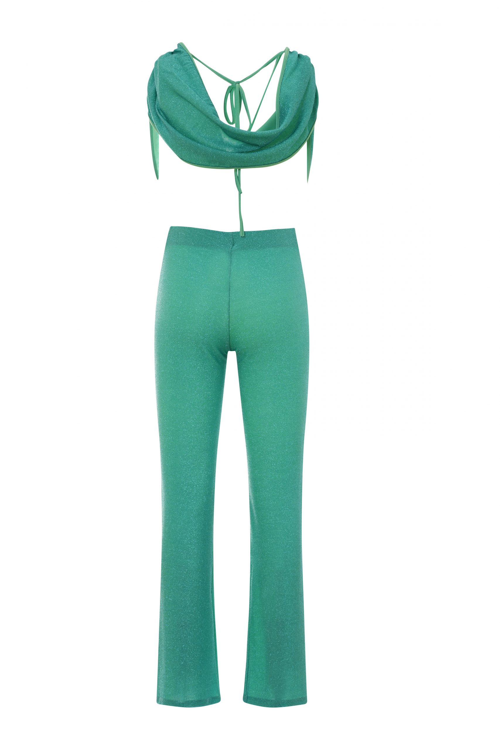 Lia is the jumpsuit with a deep front neckline, hood and bare back, perfect for trendy and daring looks. On the back are knotted ties that allow you to adjust the fit to your needs. Made of stretch lurex, the right compromise to shine with the best comfort. In solid color, in tiffany hue. Care instructions: Hand wash in cold water.