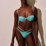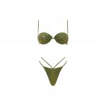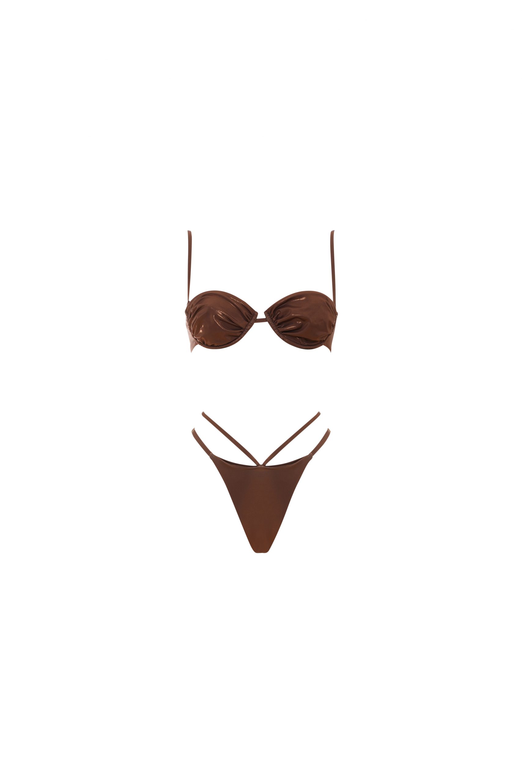 Marina is the bikini bestseller of summer, for a flawless and bright style. Combine a slim fit top, with underwire without padding and adjustable and removable suspenders, allowing you to adjust it to your needs. And one briefs With gathers and double drawstring. The closure of the top is clip-on, secure and convenient. In solid color, in bronze coloring. Made of lamina, a reflective material that adds a glamorous touch to swimwear.