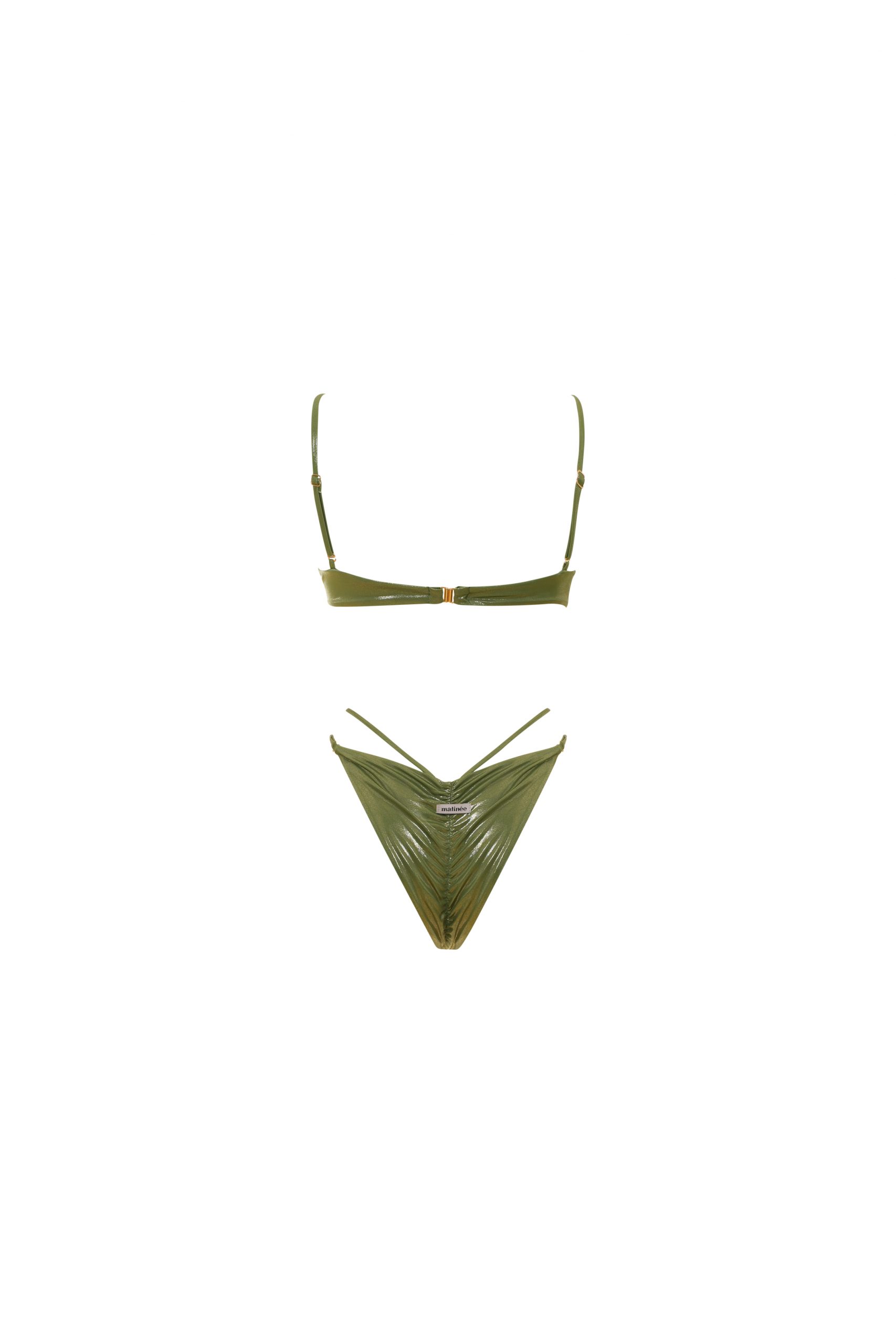 Marina is the bikini bestseller of summer, for a flawless and bright style. Combine a slim fit top, with underwire without padding and adjustable and removable suspenders, allowing you to adjust it to your needs. And one briefs With gathers and double drawstring. The closure of the top is clip-on, secure and convenient. In solid color green in color. Made of. lamina, a reflective material that adds a glamorous touch to swimwear.