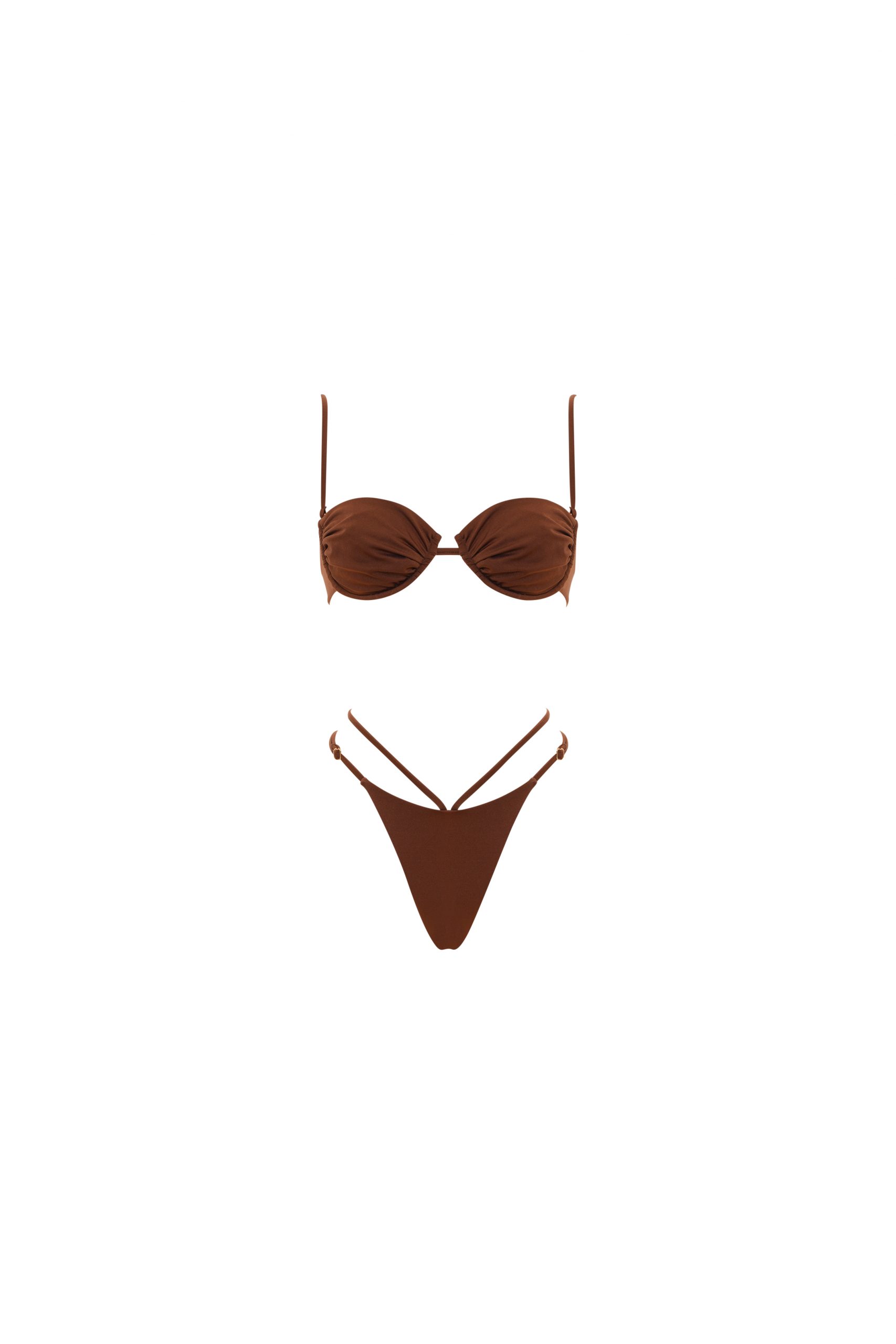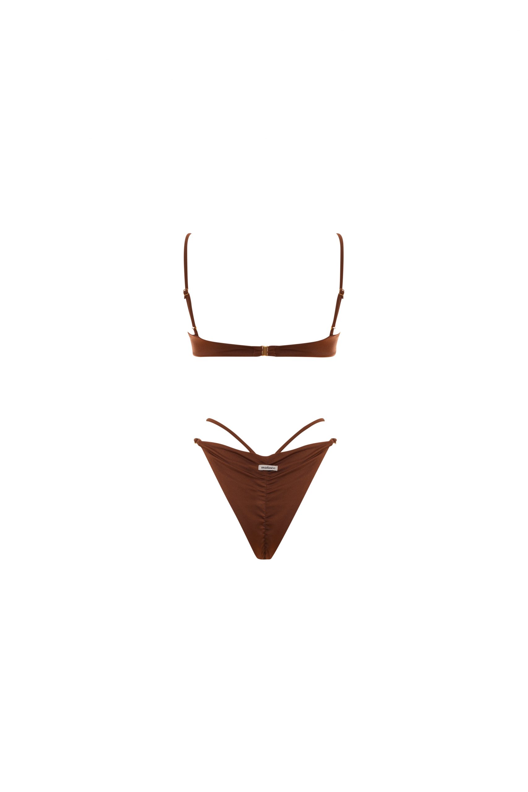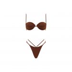 Marina is the bikini bestseller of summer, for a flawless and bright style. Combine a slim fit top, with underwire, no padding and adjustable and removable suspenders, allowing you to adjust it to your needs. And one briefs With gathers in the back and double drawstring. The closure of the top is clip-on, secure and convenient. In solid color, in rum coloring. Made of glossy lycra, for an elegant and bright look.