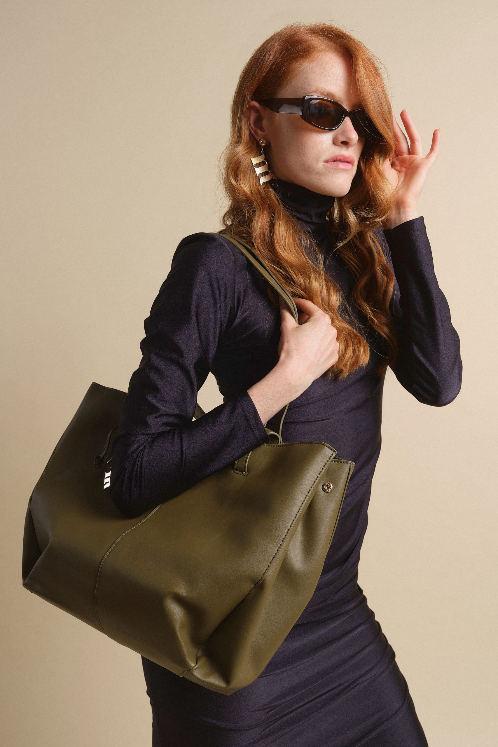Military green, roomy fan shopper with button closure and double handles. Perfect for carrying everything you need in style, combining practicality and trendy design for your everyday looks. Made of faux leather.